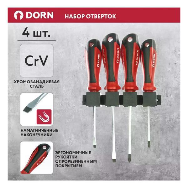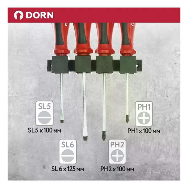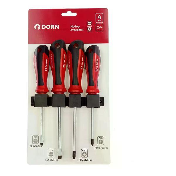 Отвертки DORN (Дорн) JBSR191240082 предназначены для винтов и шурупов со шлицами формы SL или PH. Преимущества и особенности:Намагниченные наконечники обеспечивают надежное удержание крепежа.Рукоятки с прорезиненным покрытием надежно лежат в руке и не выскальзывают.Имеют отверстия для подвешивания на крючок.Комплектация:SL5х100 мм - 1 шт.SL6х125 мм - 1 шт.PH1х100 мм - 1 шт.PH2х125 мм - 1 шт.. Тип: Наборы отверток; Бренд: DORN; Количество в упаковке (шт): 4; Диэлектрическое покрытие: Нет; Намагниченный наконечник: Да; Ударная: Нет; Материал: Хром-ванадиевая сталь; Вес 0.45; Страна производства: Китай