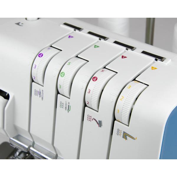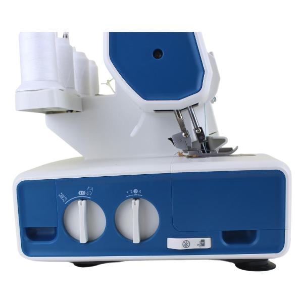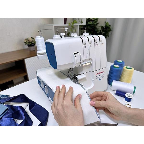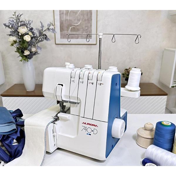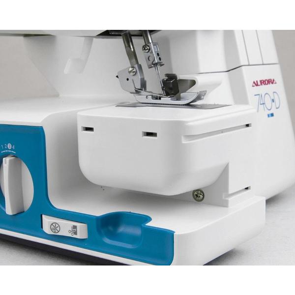 Оверлок Aurora 740D белого цвета оснащен яркой светодиодной подсветкой рабочей зоны. Тип — 2/3/4 ниточный. Длина стежка варьируется от 1 до 5 мм. Лапка поднимается на 5 мм. Скорость шитья плавно регулируется (максимально — 1200 стежков в минуту). Петлитель заправляется вручную. При поднятии лапки натяжение нити автоматически ослабляется. Верхний нож отключается. Управление осуществляется с помощью рычагов на корпусе. Габариты модели — 29х28х35 см. Вес изделия — 7,5 кг. Корпус сделан из пластика и металла, оснащен дифференциальным транспортером.