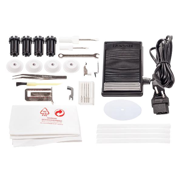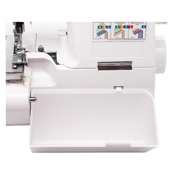 Корпус модели оснащен устойчивыми нескользящими опорами, четырьмя катушкодержателями, откидывающимся столиком для заправки нитей, отсеком для хранения аксессуаров, лотком для обрезков. Высота подъема стандартной лапки — до 6 мм, ее давление регулируется автоматически.