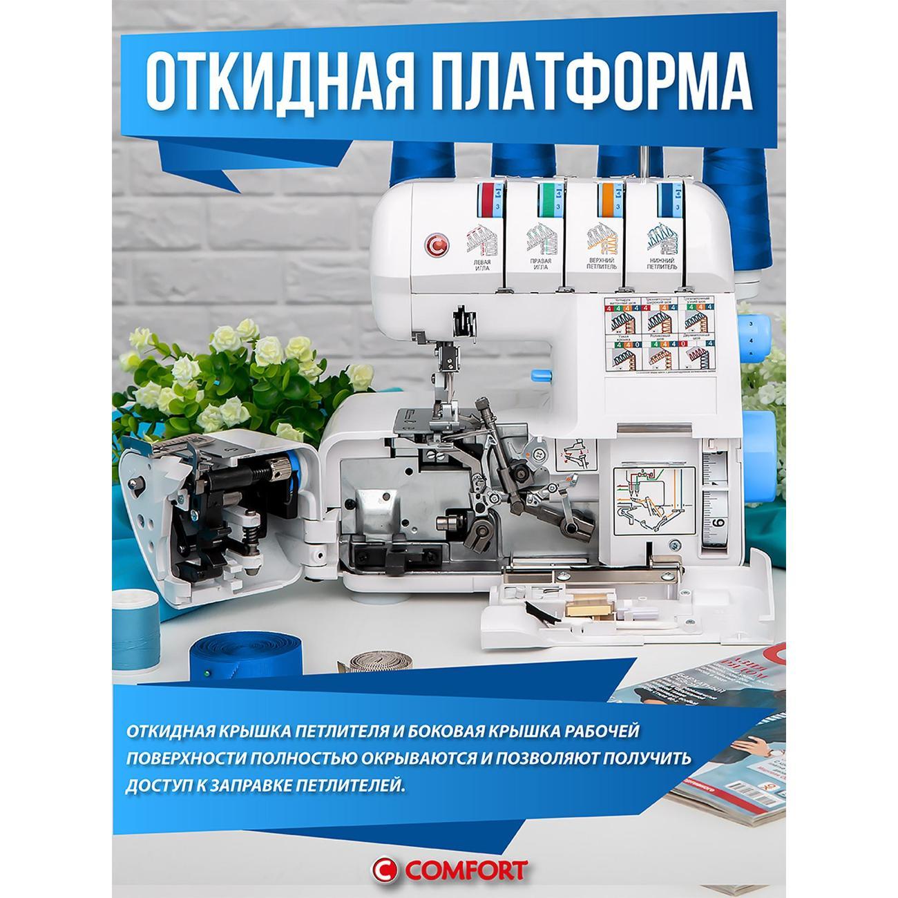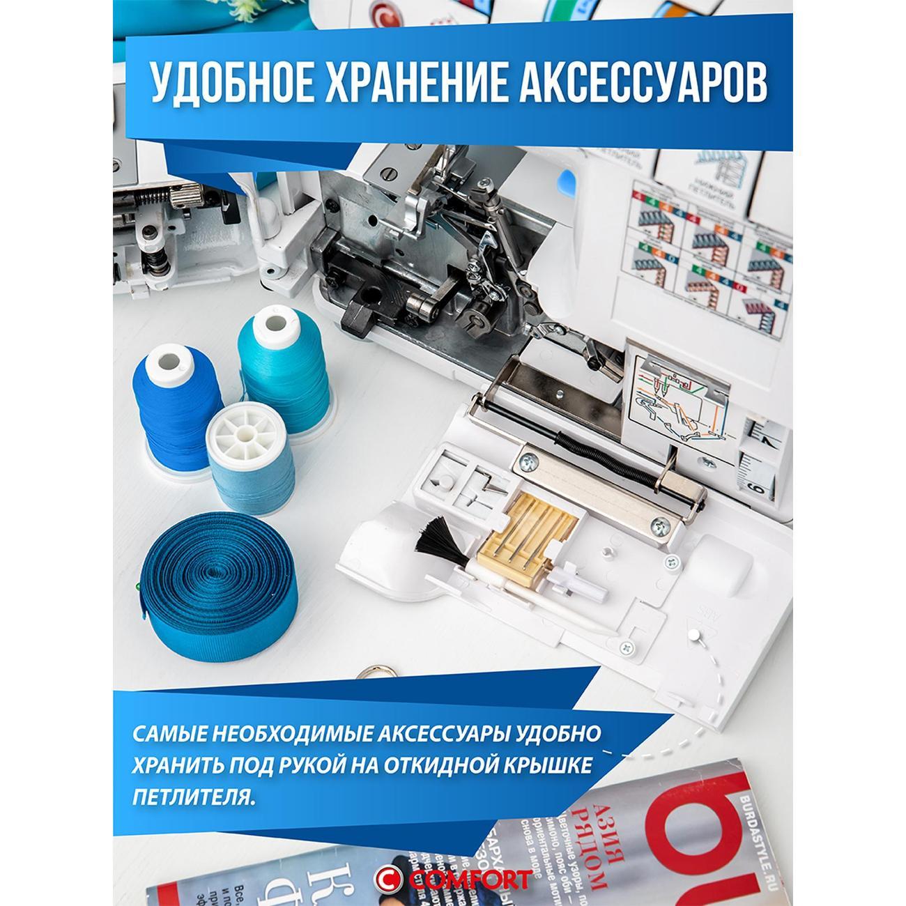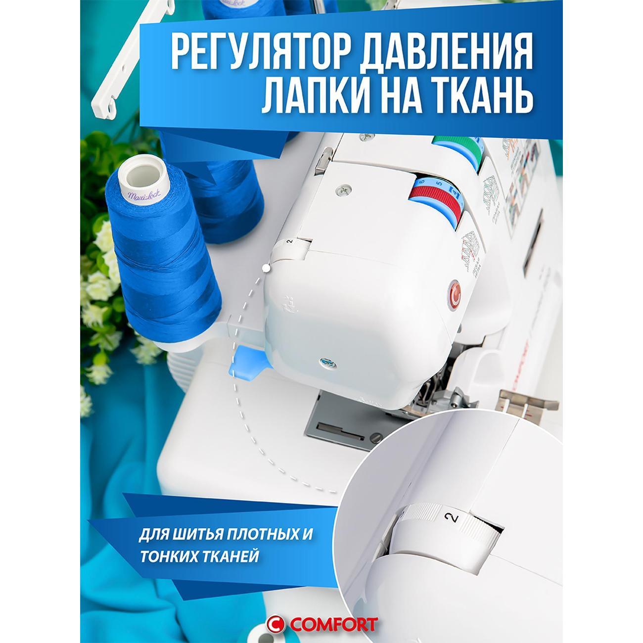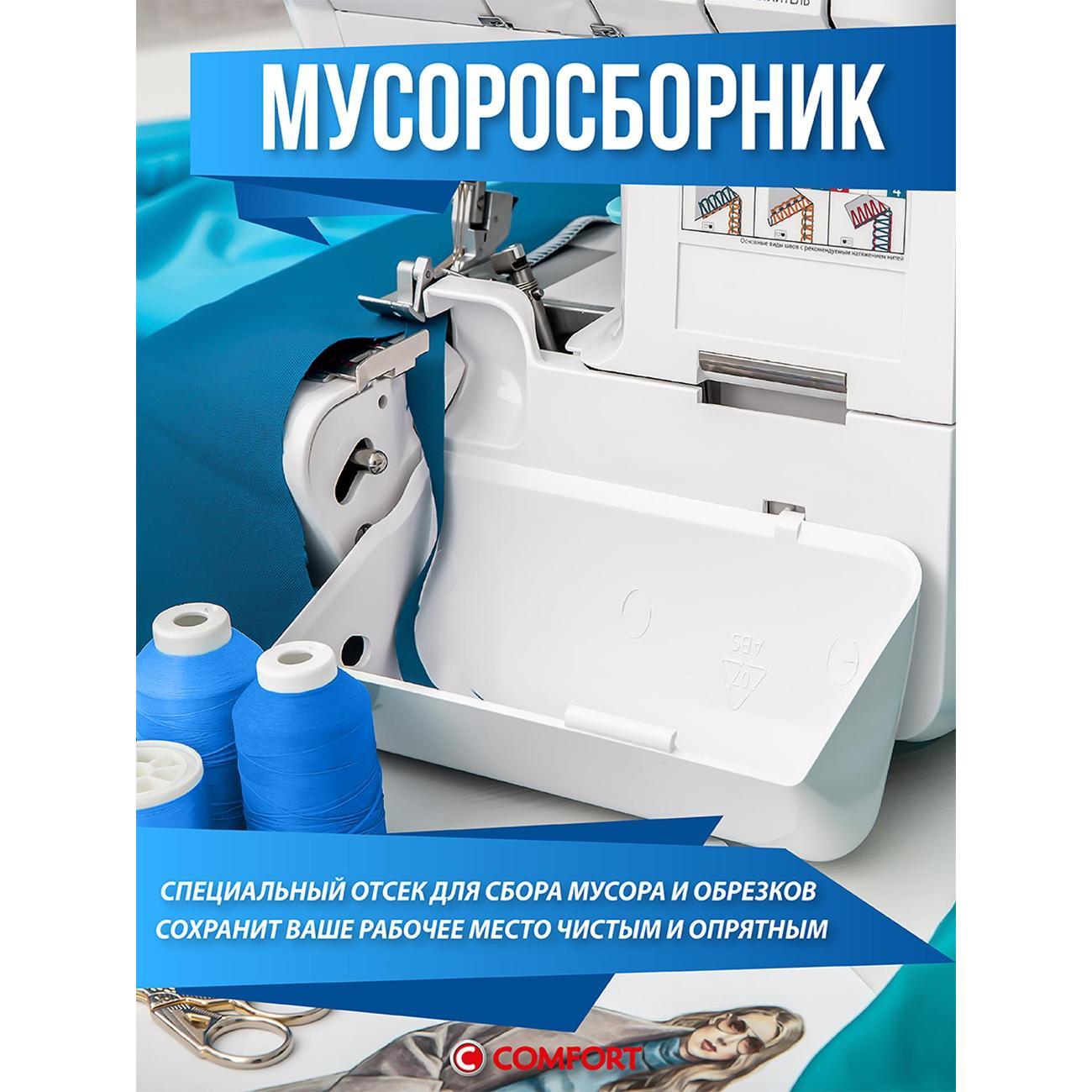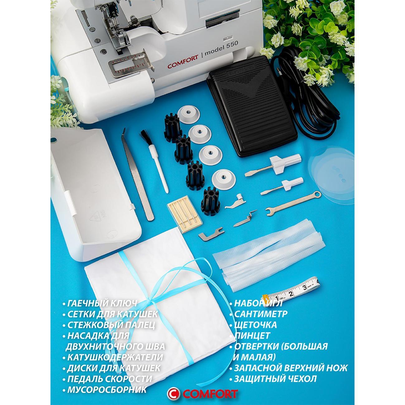 Оверлок Comfort 550 используют для всех видов тканей. Регулировка натяжения нити проводится в ручном режиме. Тип управления — электромеханическое. Стандартная лапка поднимается на максимальную высоту 7 мм. Длина стежка варьируется от 1 до 5 мм. Есть мусоросборник, отсек для аксессуаров.
