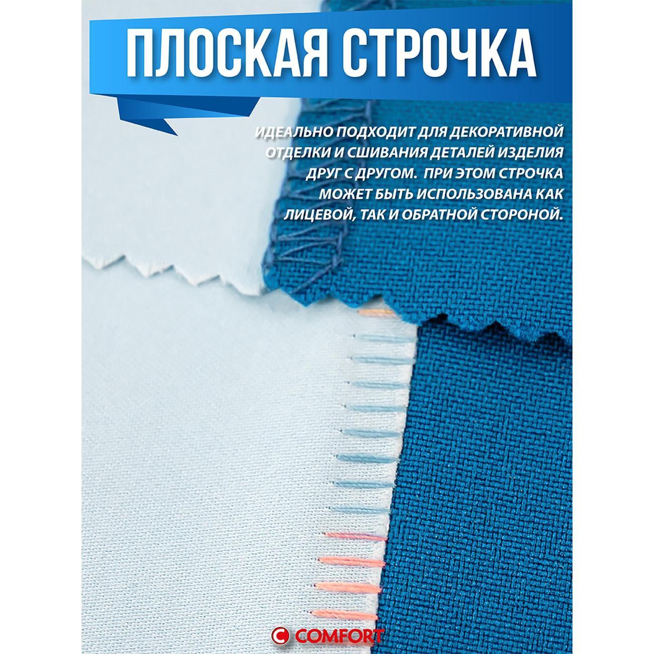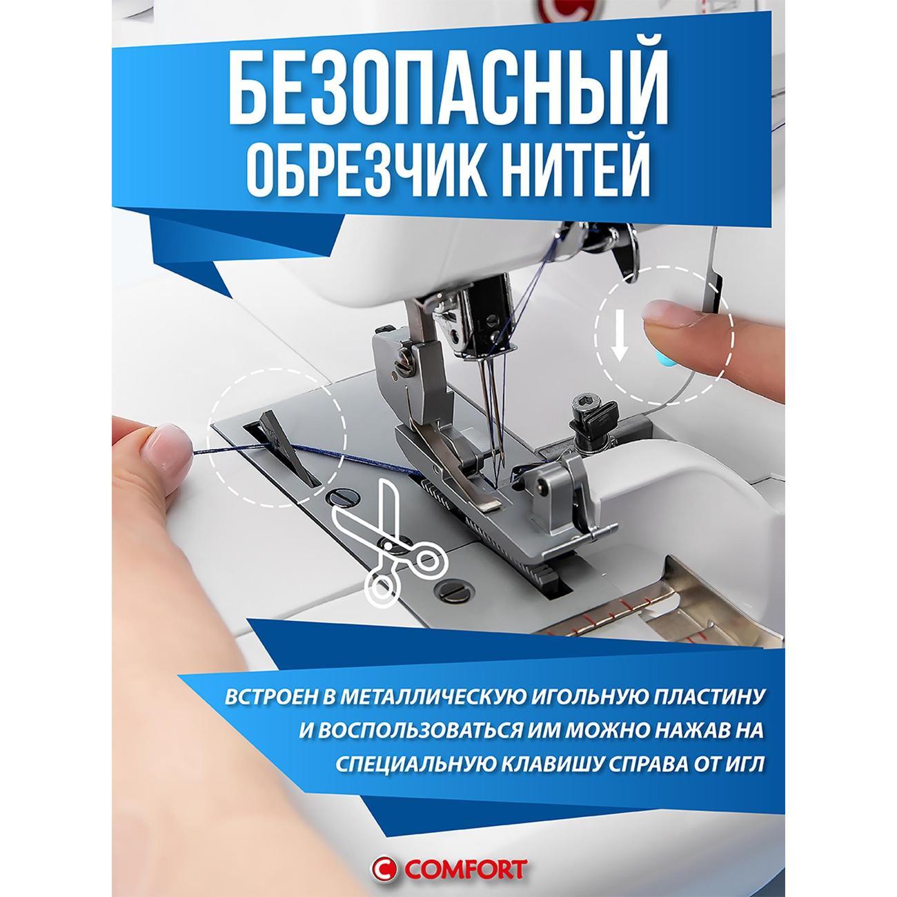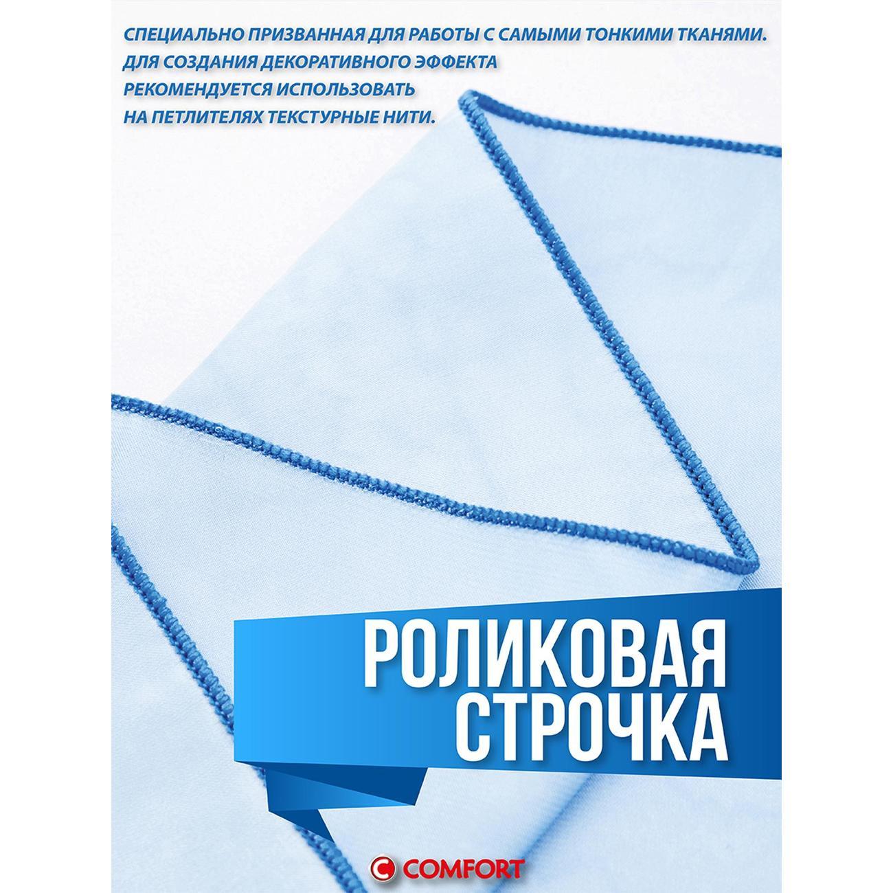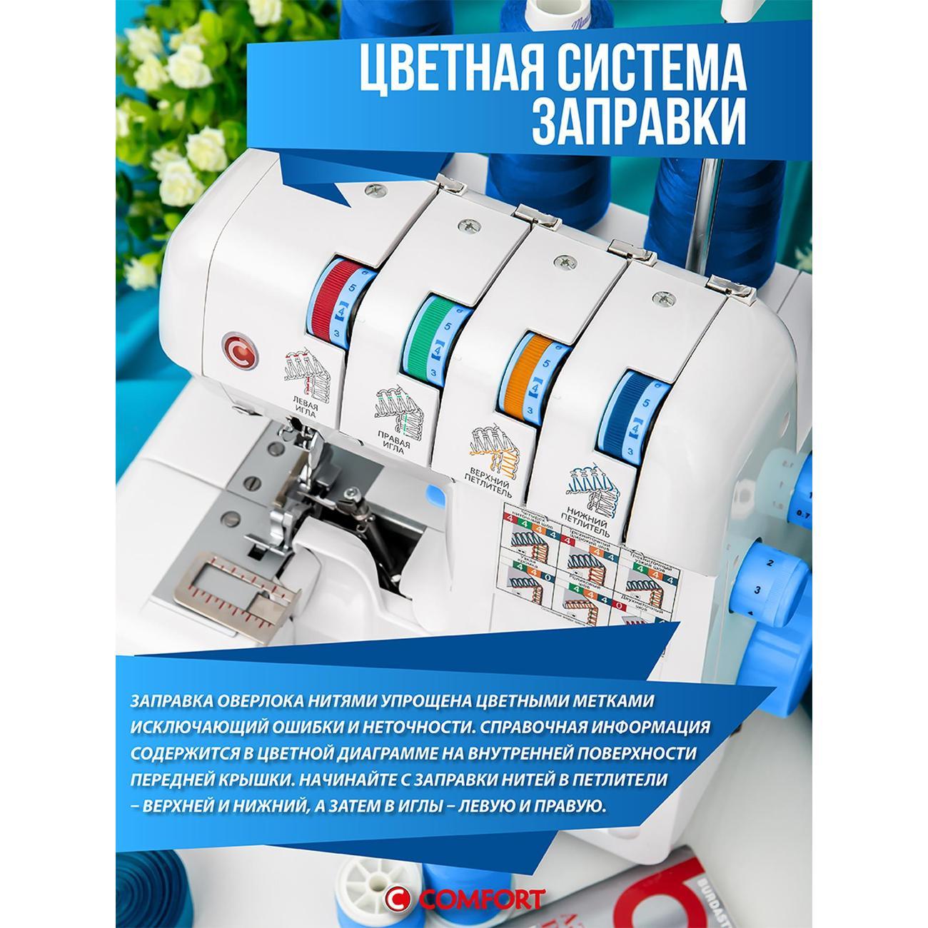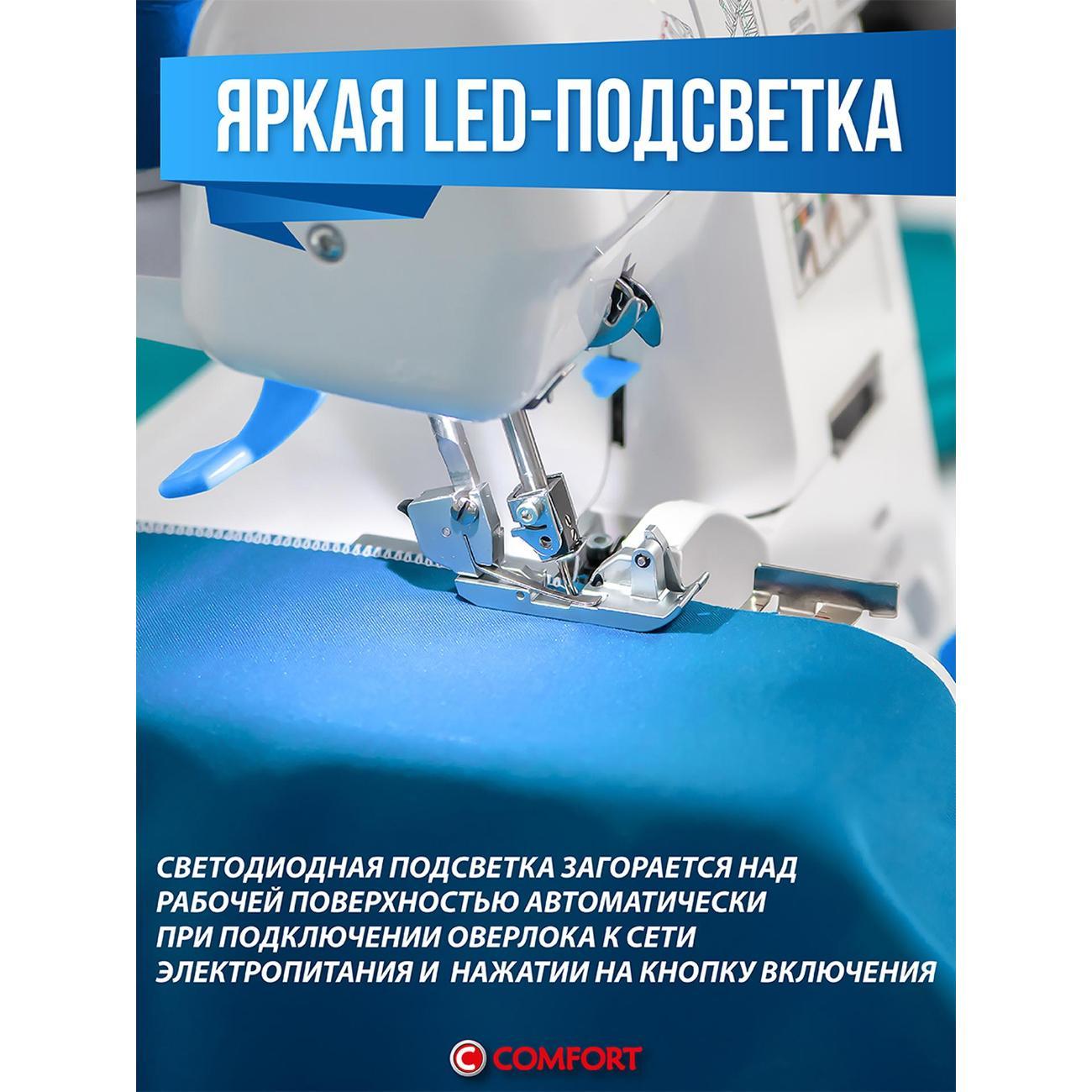 Оверлок Comfort 550 используют для всех видов тканей. Регулировка натяжения нити проводится в ручном режиме. Тип управления — электромеханическое. Стандартная лапка поднимается на максимальную высоту 7 мм. Длина стежка варьируется от 1 до 5 мм. Есть мусоросборник, отсек для аксессуаров.