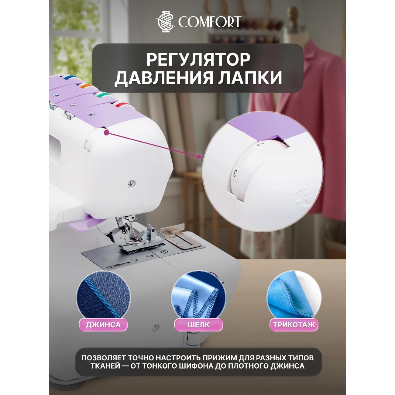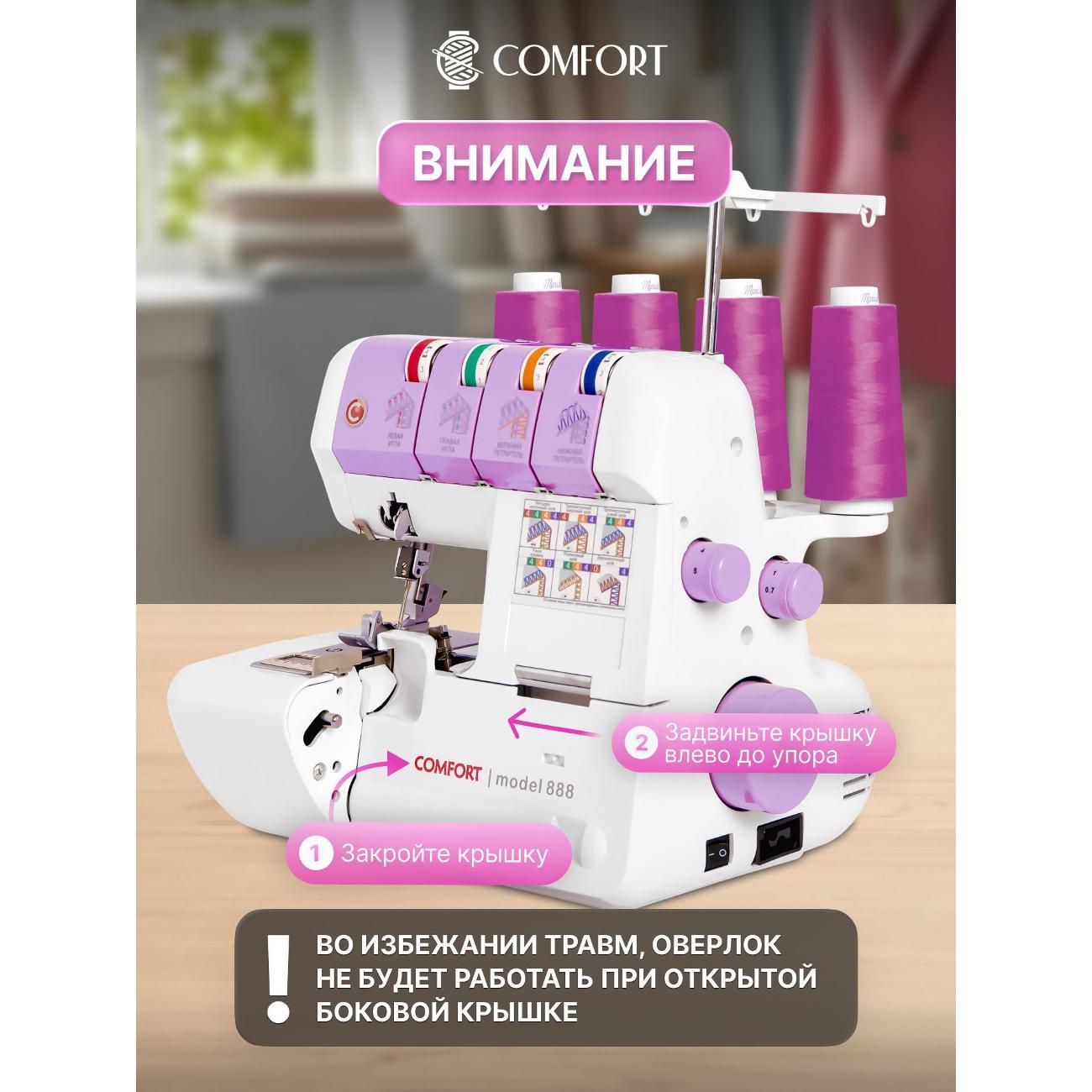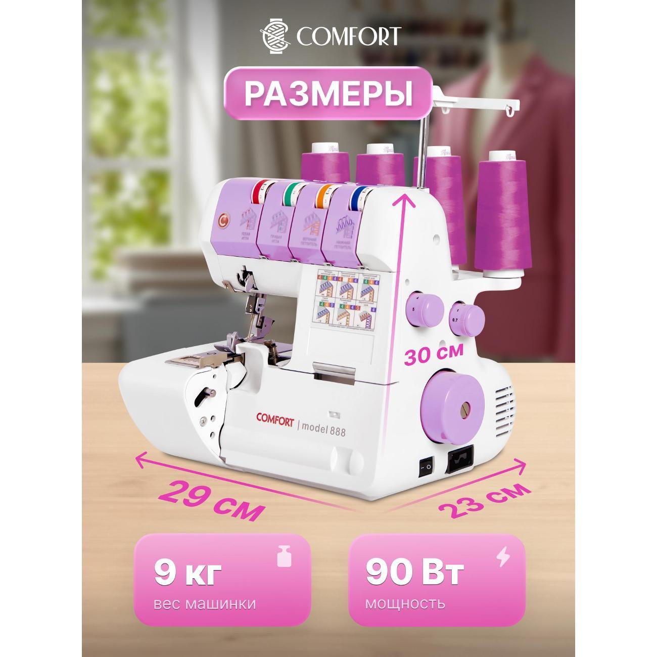 Оверлок Comfort 888 используют для всех видов тканей. Регулировка натяжения нити проводится в ручном режиме. Тип управления — электромеханическое. Стандартная лапка поднимается на максимальную высоту 7 мм. Длина стежка варьируется от 1 до 5 мм. Есть мусоросборник, отсек для аксессуаров.