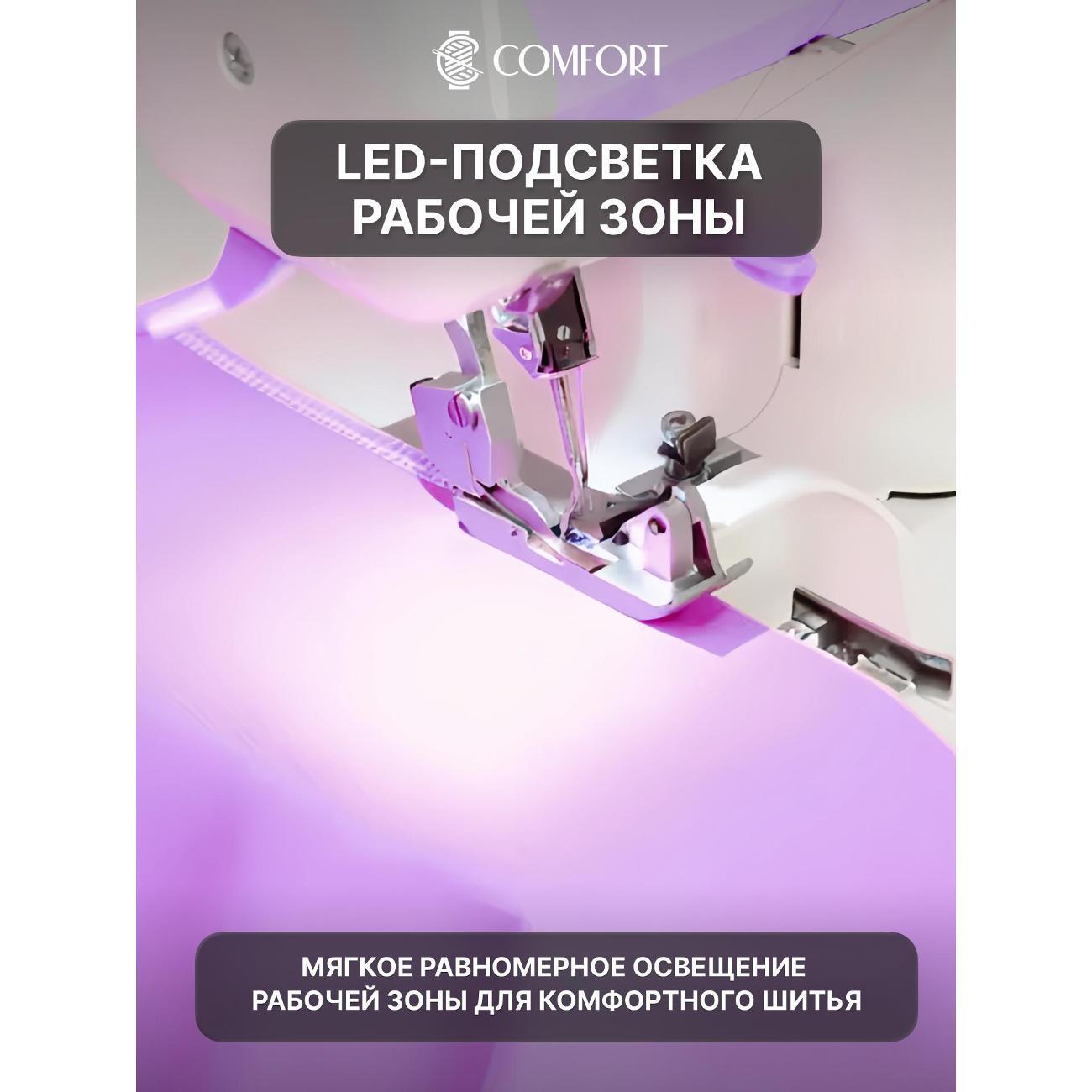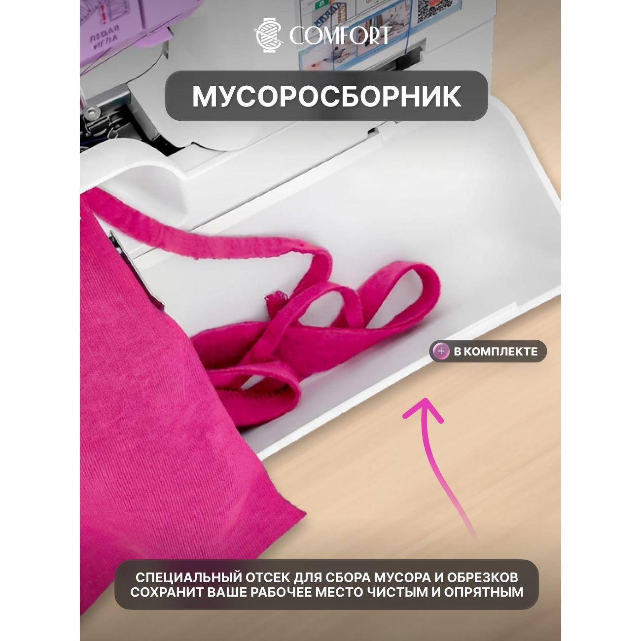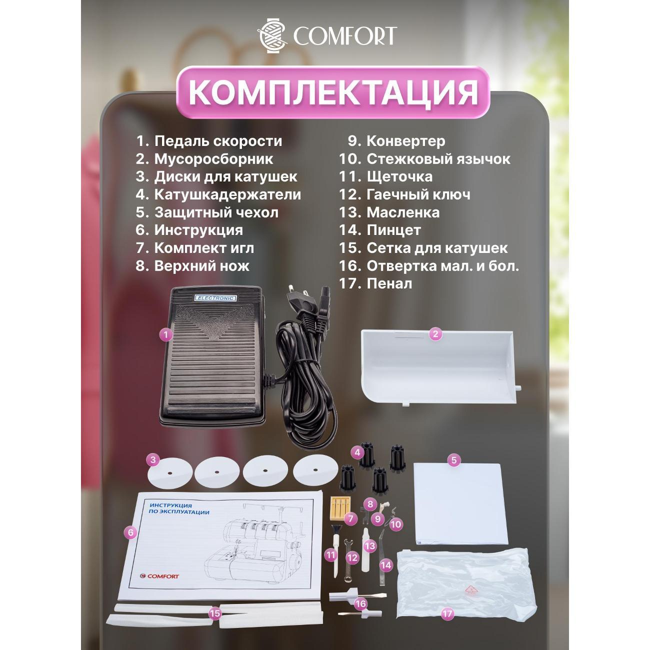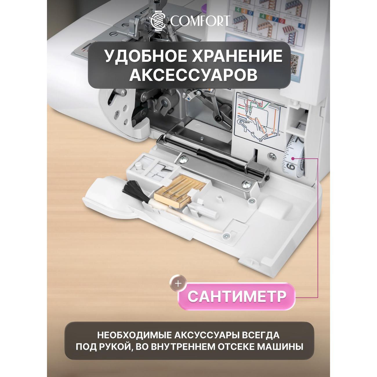 Оверлок Comfort 888 используют для всех видов тканей. Регулировка натяжения нити проводится в ручном режиме. Тип управления — электромеханическое. Стандартная лапка поднимается на максимальную высоту 7 мм. Длина стежка варьируется от 1 до 5 мм. Есть мусоросборник, отсек для аксессуаров.