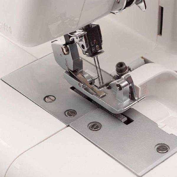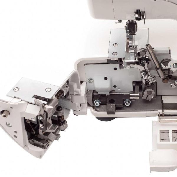 Белый корпус из пластика оборудован дифференциальным транспортером и нитеобрезателем. Встроен отсек, используемый для хранения аксессуаров. Предусмотрен откидывающийся столик для заправки. Для переноски установлена удобная ручка. Внизу корпуса размещены прорезиненные ножки. Комплектация включает чехол, сумку для принадлежностей, набор игл, мусоросборник, четыре катушкодержателя, четыре сетки для нитей/катушек, две отвертки, пинцет, кисточку для чистки. Встроено LED-освещение.