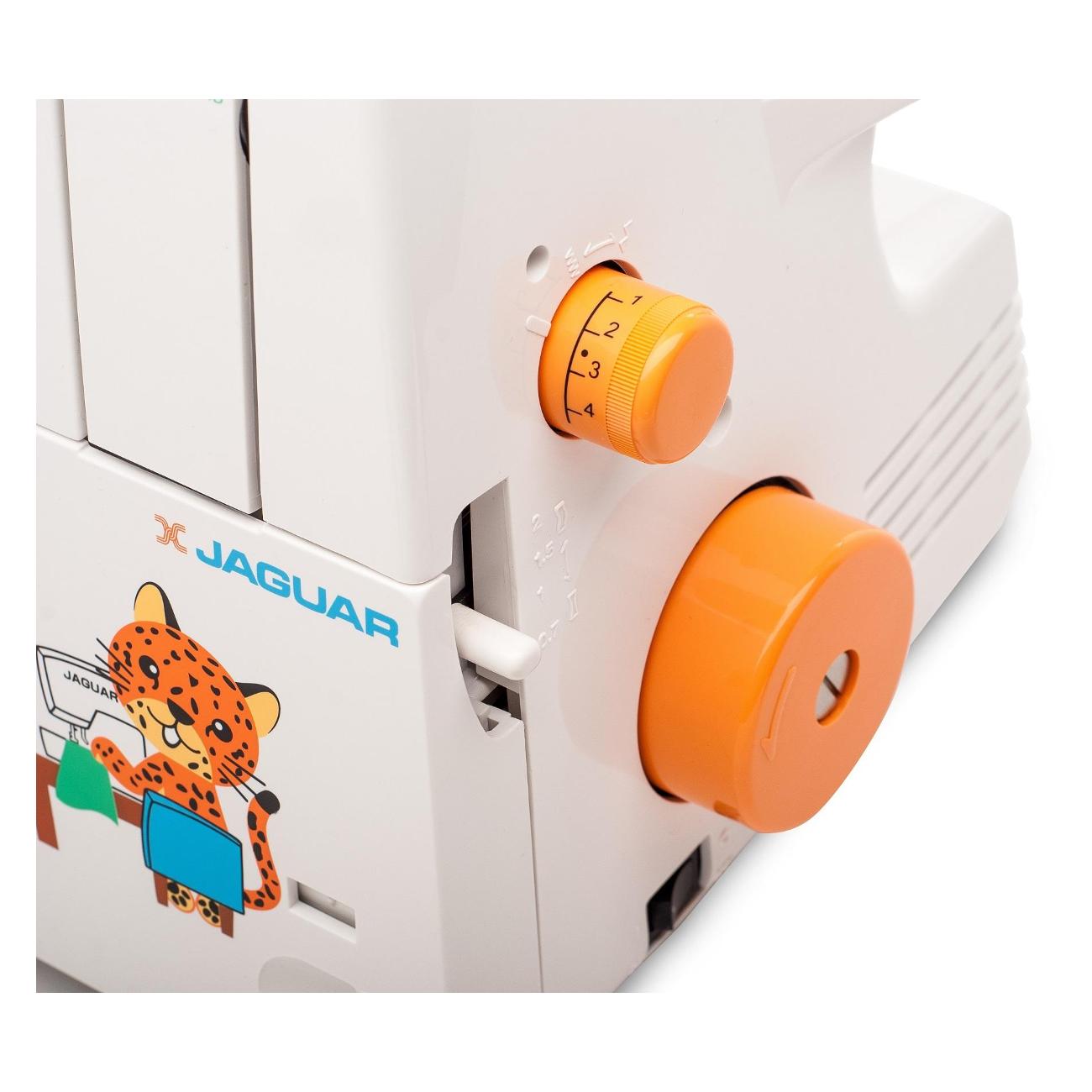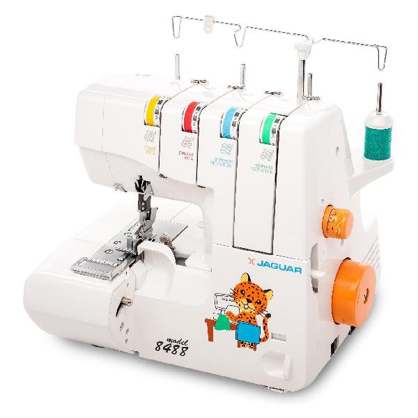 Оверлок Jaguar 8488 мощностью 120 Вт питается от сети посредством кабеля длиной 1,4 м. Модель оснащена LED-подсветкой, откидывающимся столиком для заправки и стандартной лапкой, высоту которой можно регулировать до 7 мм. Устройство обеспечивает скорость шитья 1300 стежков в минуту при ширине шва 4 мм. Прибор получил мусоросборник, отсек для хранения мелочей, ручной регулятор натяжения нити и направляющие линии для шва.