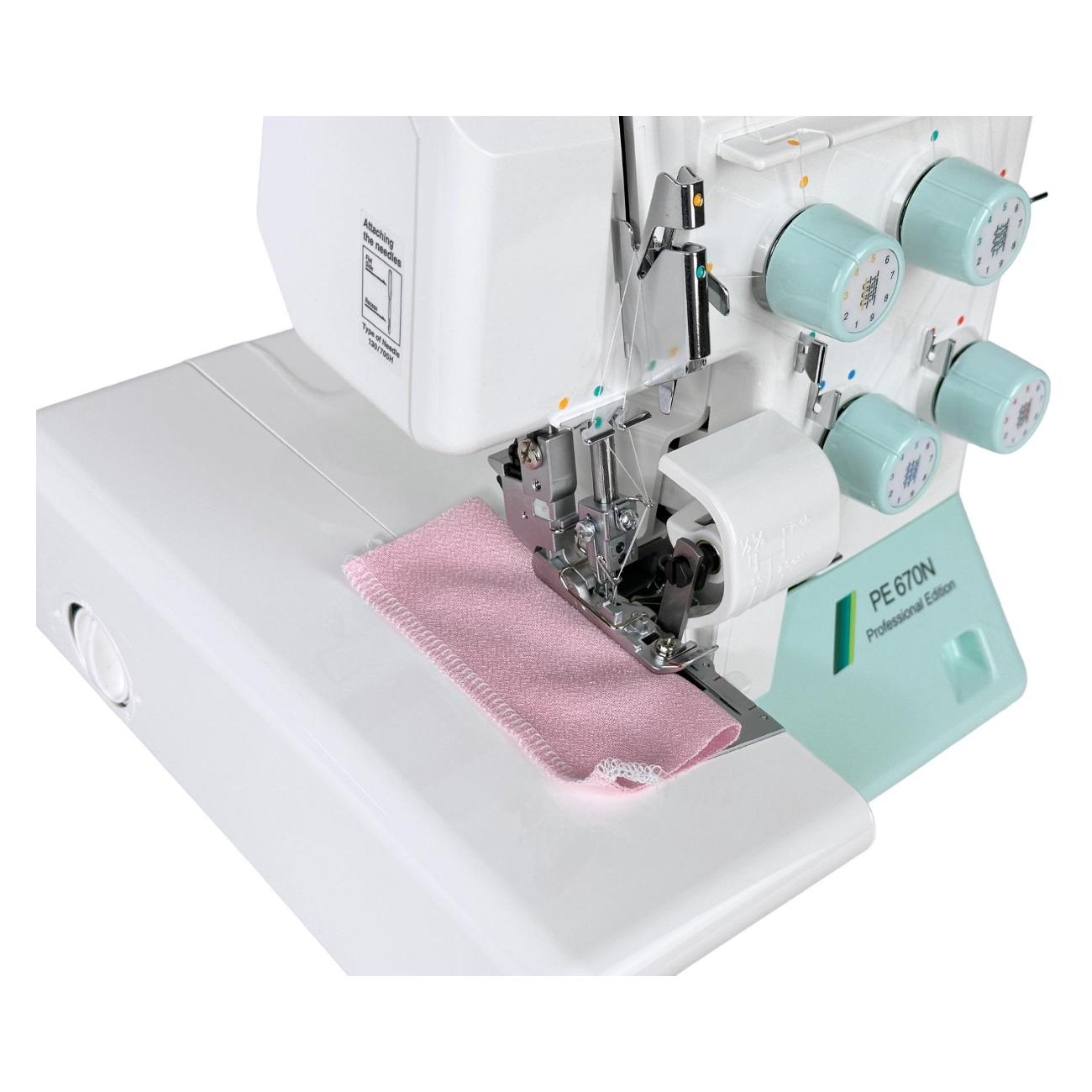 Оверлок Juki PE 670N — четырехниточная модель, которая легко и быстро обработает любые виды тканей, в том числе легкие, плотные, деликатные и тянущиеся. При необходимости можно отключать нож для совершения декоративных строчек. Тип челнока — горизонтально ротационный. В арсенале предусмотрено наличие 8 швейных операций, которые помогают создавать разные виды швов, включая ролевой. Максимальная длина и ширина стежка могут составлять 4 мм и 7 мм соответственно. Скорость шитья достигает 1500 стежков/мин. Высота подъема лапки — 8 мм.
