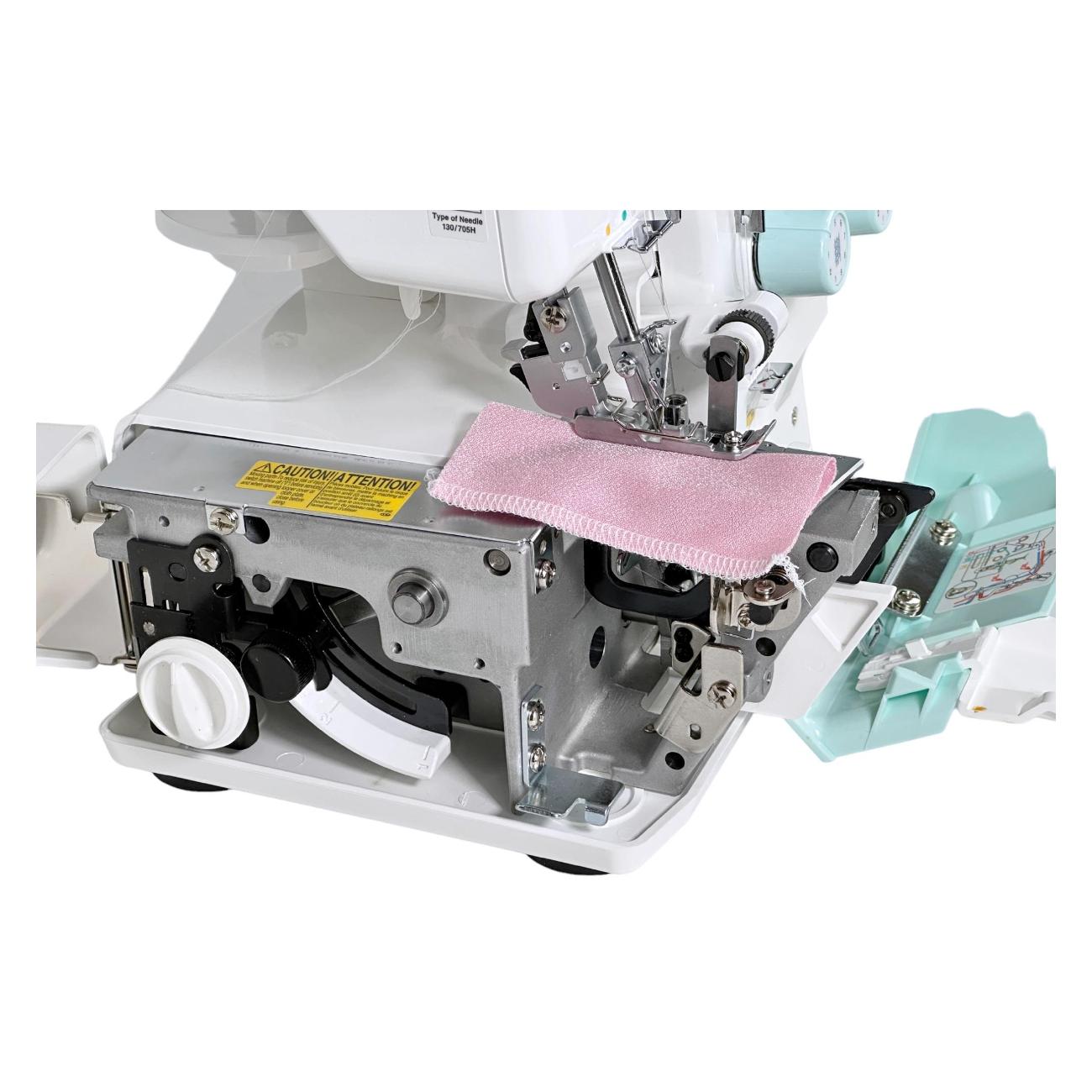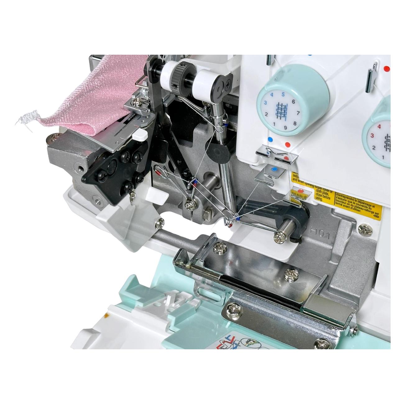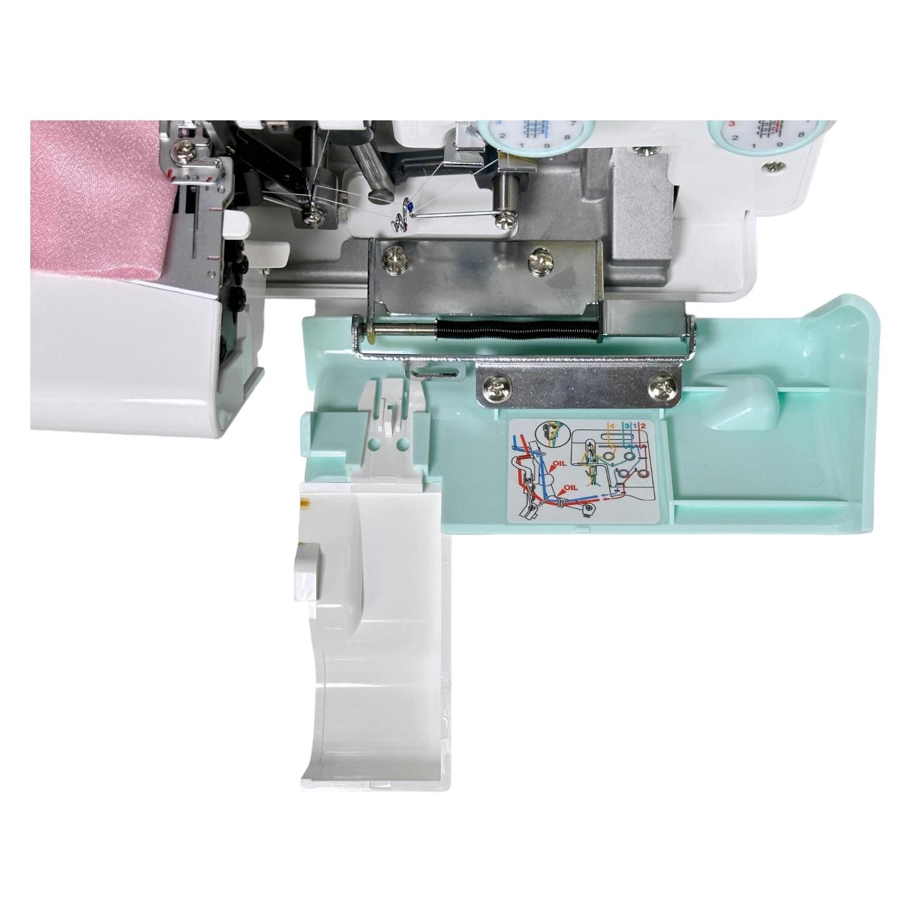 Показатель потребляемой мощности — 90 Вт. Управление настройками производится с помощью дисковых регуляторов, находящихся на фронтальной части конструкции. Опция дифференциальной подачи ткани дает возможность собирать или растягивать изделия во время шитья. Корпус модели выполнен из прочного пластика. Прорезиненные ножки обеспечивают высокую устойчивость на столе. Встроенная подсветка сохраняет хорошую видимость рабочей зоны. Дополнительный комфорт при работе гарантируют набор игл, масло для смазки, нитевдеватель, сетки для нитей/катушек, сумка, отвертки, пинцет, кисточка для чистки.