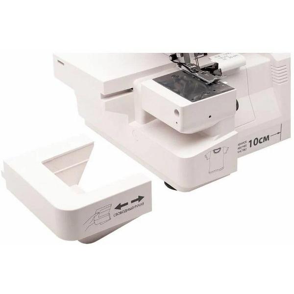 Присутствует регулятор дифференциальной подачи ткани. Устройство быстро переключается на ролевой шов. Длина стежка составляет от 1 до 5 мм. Пластиковый корпус оснащен нитеобрезателем, ручкой для переноски, отеком для принадлежностей. Степень натяжения нитей регулируется вручную.