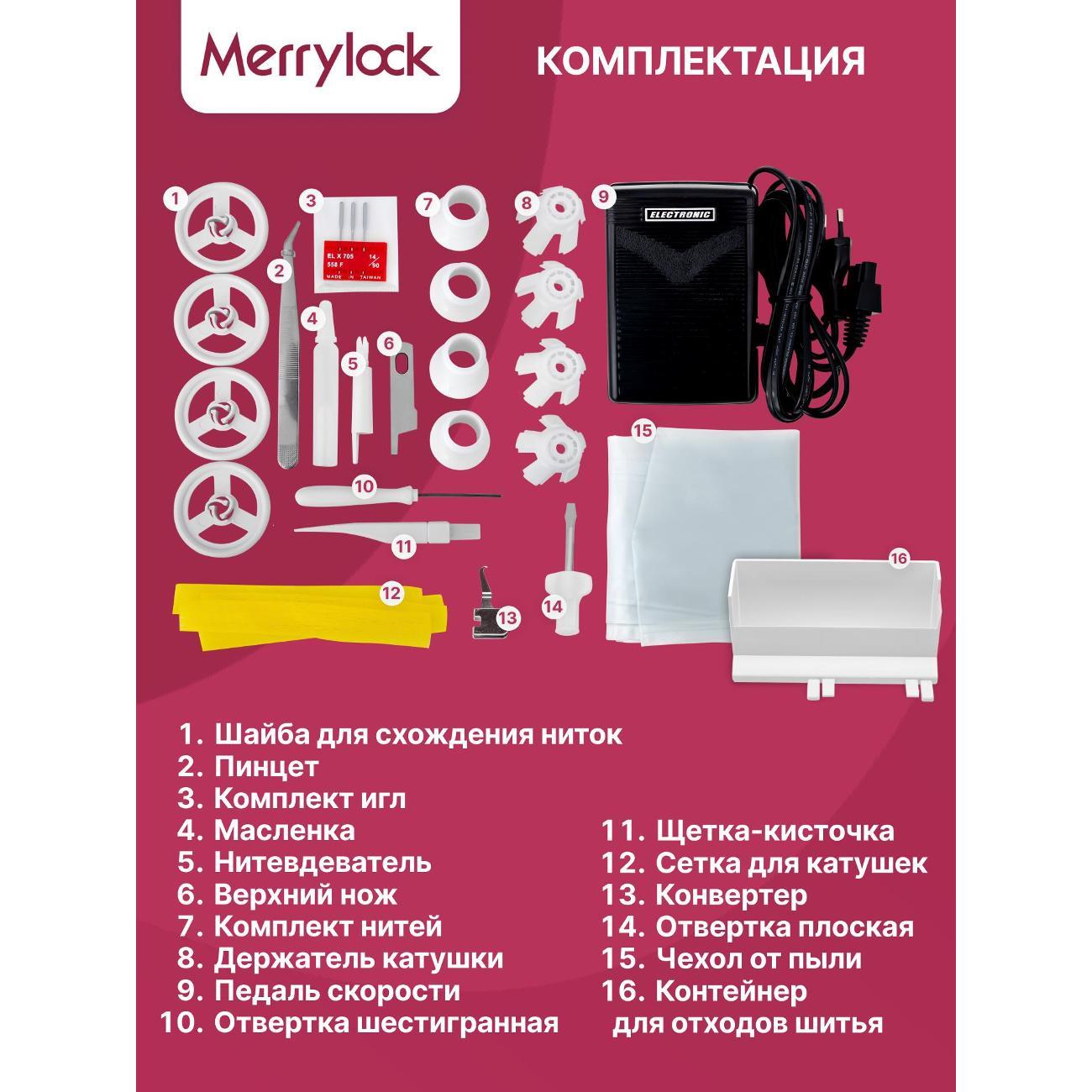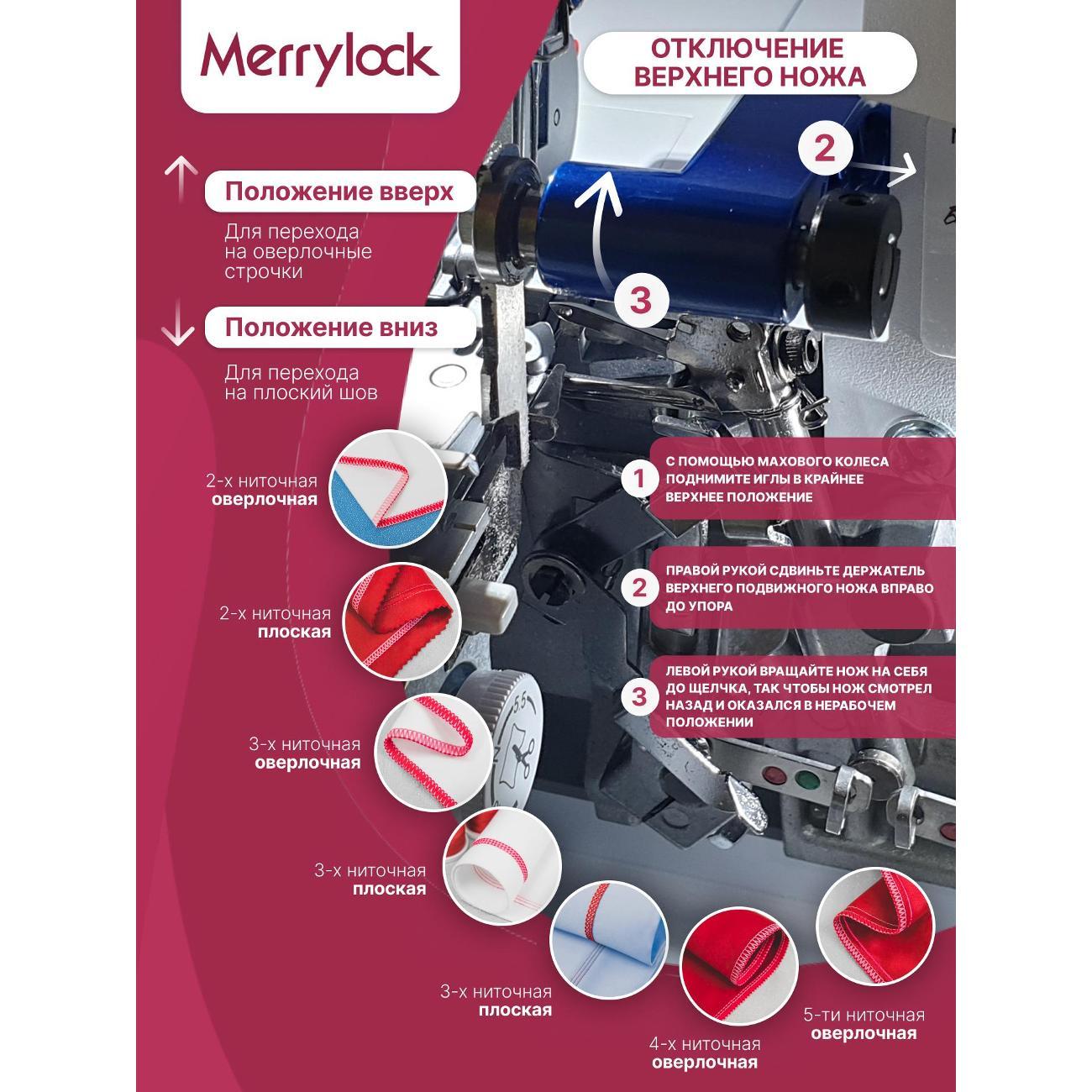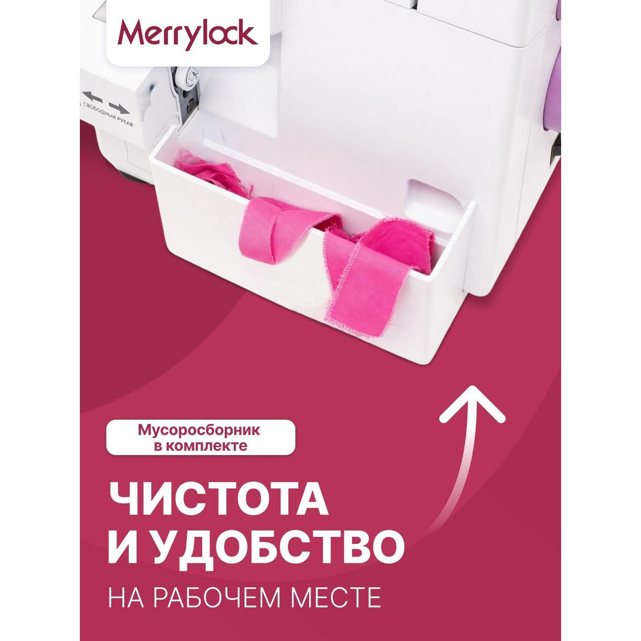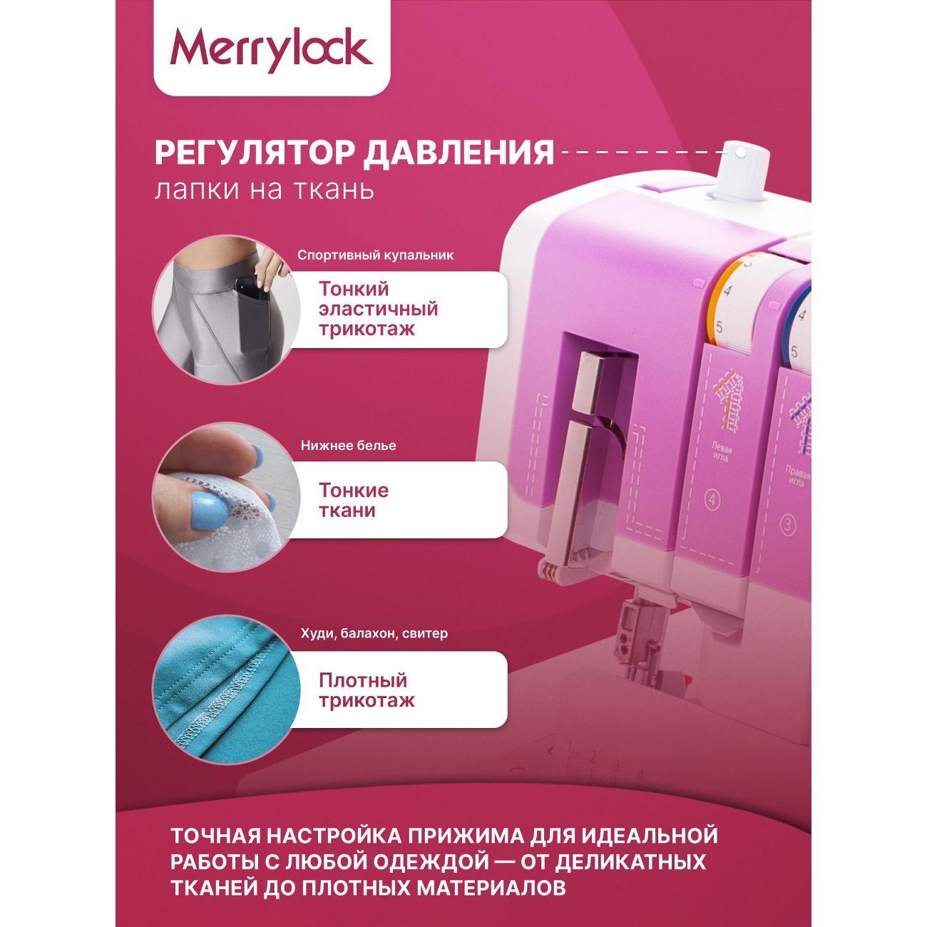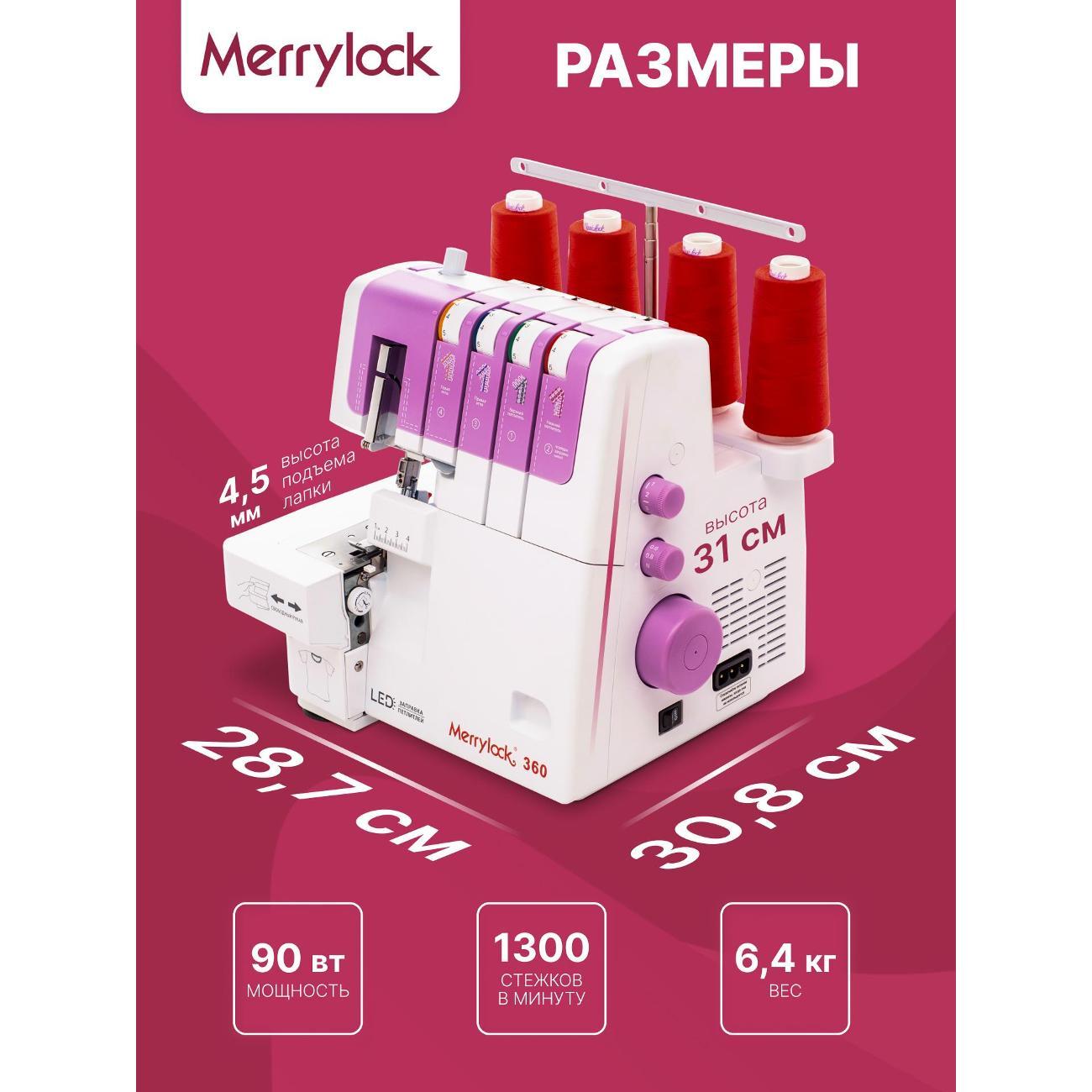 Оверлок Merrylock 360 предназначен для создания разнообразных видов швов при обработке края текстильных изделий. Позволяет выполнить 16 видов швов, включая двухниточный оверлочный узкий шов, плоский узкий шов, ролевой подрубочный шов. Благодаря дифференциальному транспортеру и регулировке длины стежка от 0 мм до 5 мм возможно создание аккуратных и прочных швов на различных тканях.