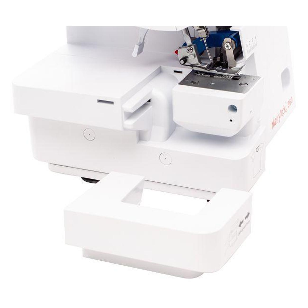 Оверлок Merrylock 360 белого цвета с фиолетовыми вставками потребляемой мощностью 90 Вт оборудован электромеханическим типом управления. Заправка петлителя и натяжение нити происходят вручную. Стандартную лапку можно максимально поднять на 6 мм и отрегулировать давление. Используются иглы типа ELх705. Скорость шитья плавно регулируется. Длина стежка варьируется от 0 до 4 мм. Ширина шва — 7 мм. Предусмотрена дифференциальная подача материала, съемная рукавная платформа, цветная маркировка нитей и светодиодное освещение.