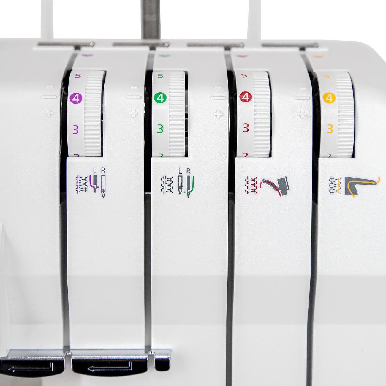 Выполняя функцию оверлочной машины и обметки срезов, устройство позволяет делать строчки: четырехниточные — обметочные; трехниточные — обметочные (широкая и узкая), Flatlock (широкая и узкая), скрученная; двухниточные — обметочная (широкая и узкая), обернутая обметочная (широкая и узкая), скрученная обметочная. Цветная система на корпусе служит подсказкой, которая помогает заправить нити в петлитель. Справочная информация содержится в цветной диаграмме на внутренней поверхности передней крышки. Электромеханическое управление обеспечивает контроль над работой машины, позволяет настроить ее под индивидуальные потребности.