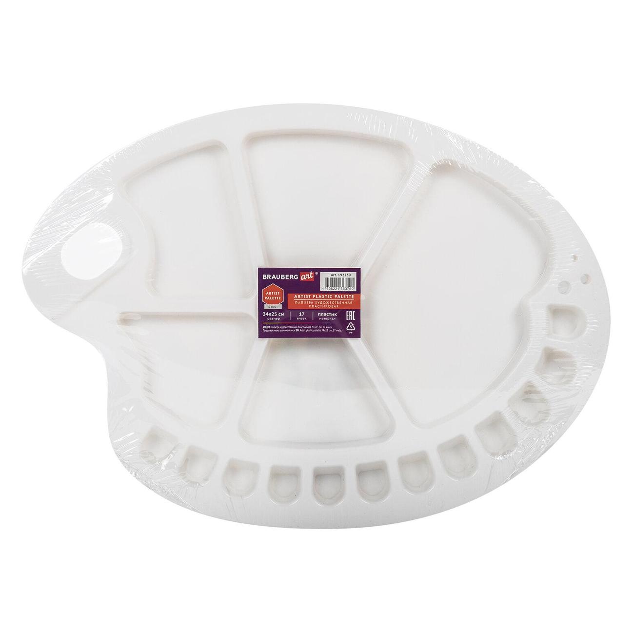 Большая и легкая пластиковая палитра подходит для работы со всеми типами художественных красок: масляными, акриловыми, темперными, гуашевыми, акварельными. Имеет 12 ячеек и 5 больших отсеков для смешивания красок. Палитру овальной формы удобно держать в руке. Размеры - 34х25 см.