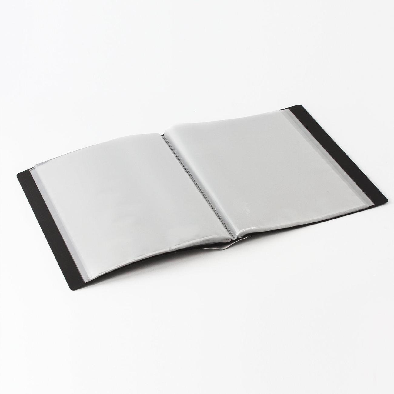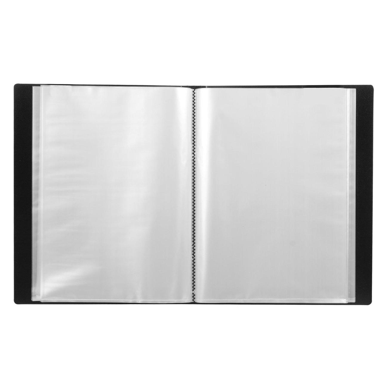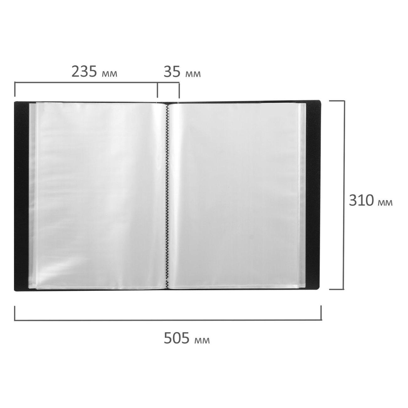 На корешке имеется карман для маркировки содержимого. Папка изготовлена из качественного пластика толщиной 0,9 мм с антибликовой фактурой, а ширина корешка составляет 35 мм. Содержит 80 вкладышей, позволяющих хранить документы формата А4 и обеспечивающих их надежную защиту от попадания влаги, пыли и прочих повреждений. Поставляется в индивидуальной упаковке.