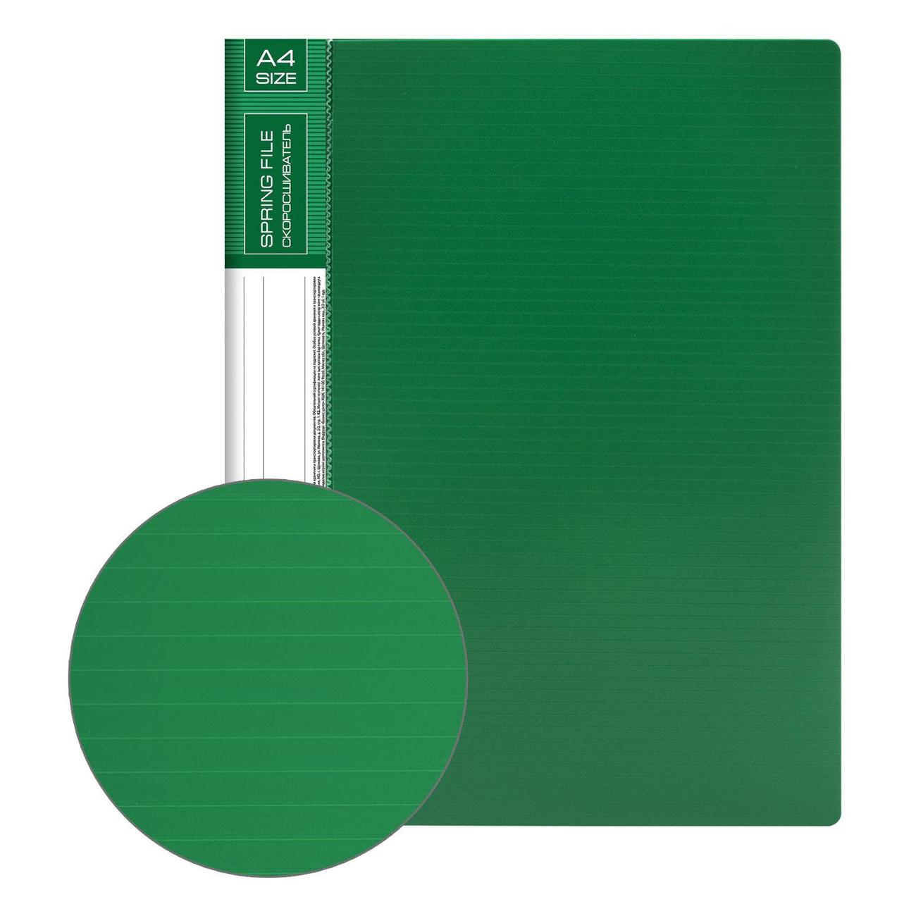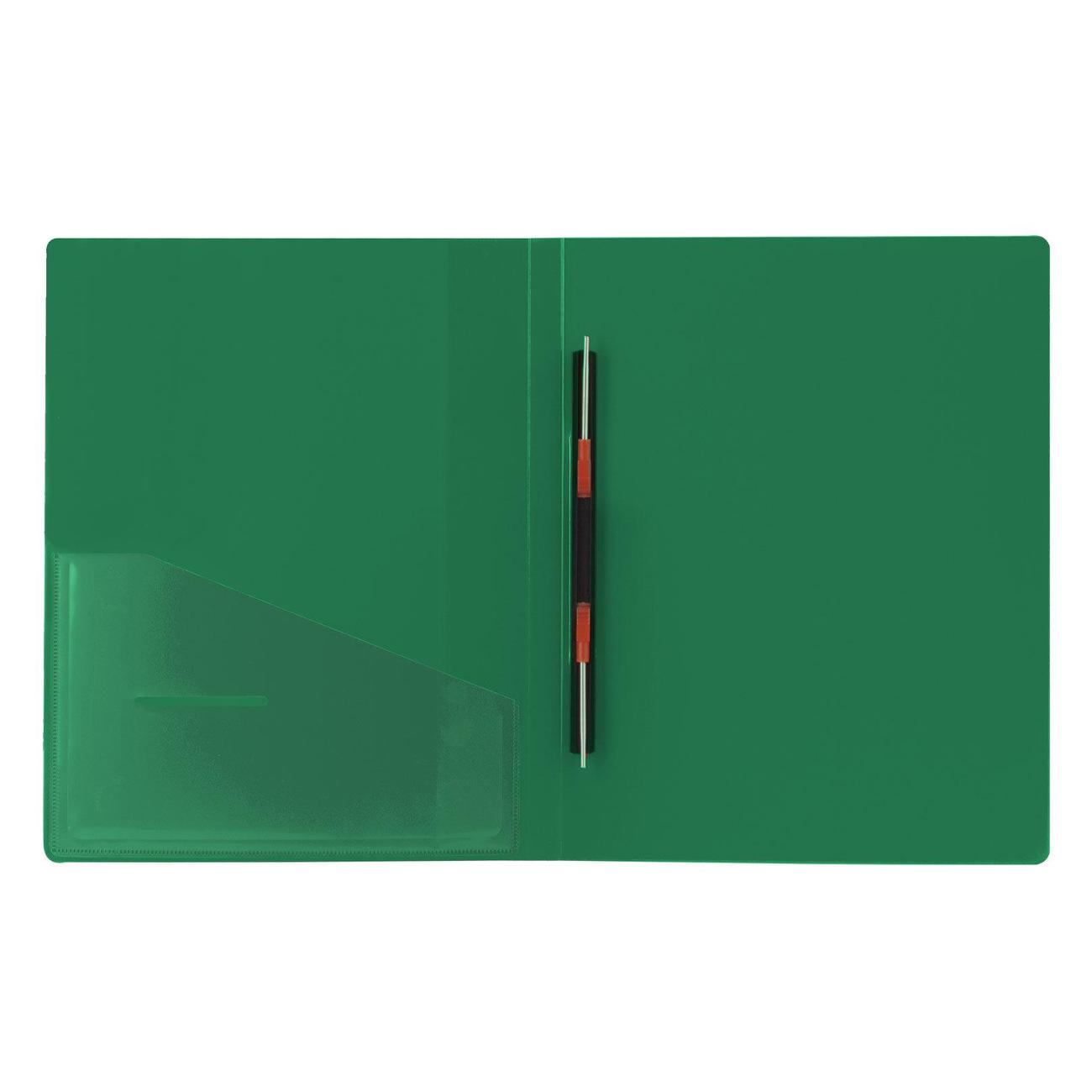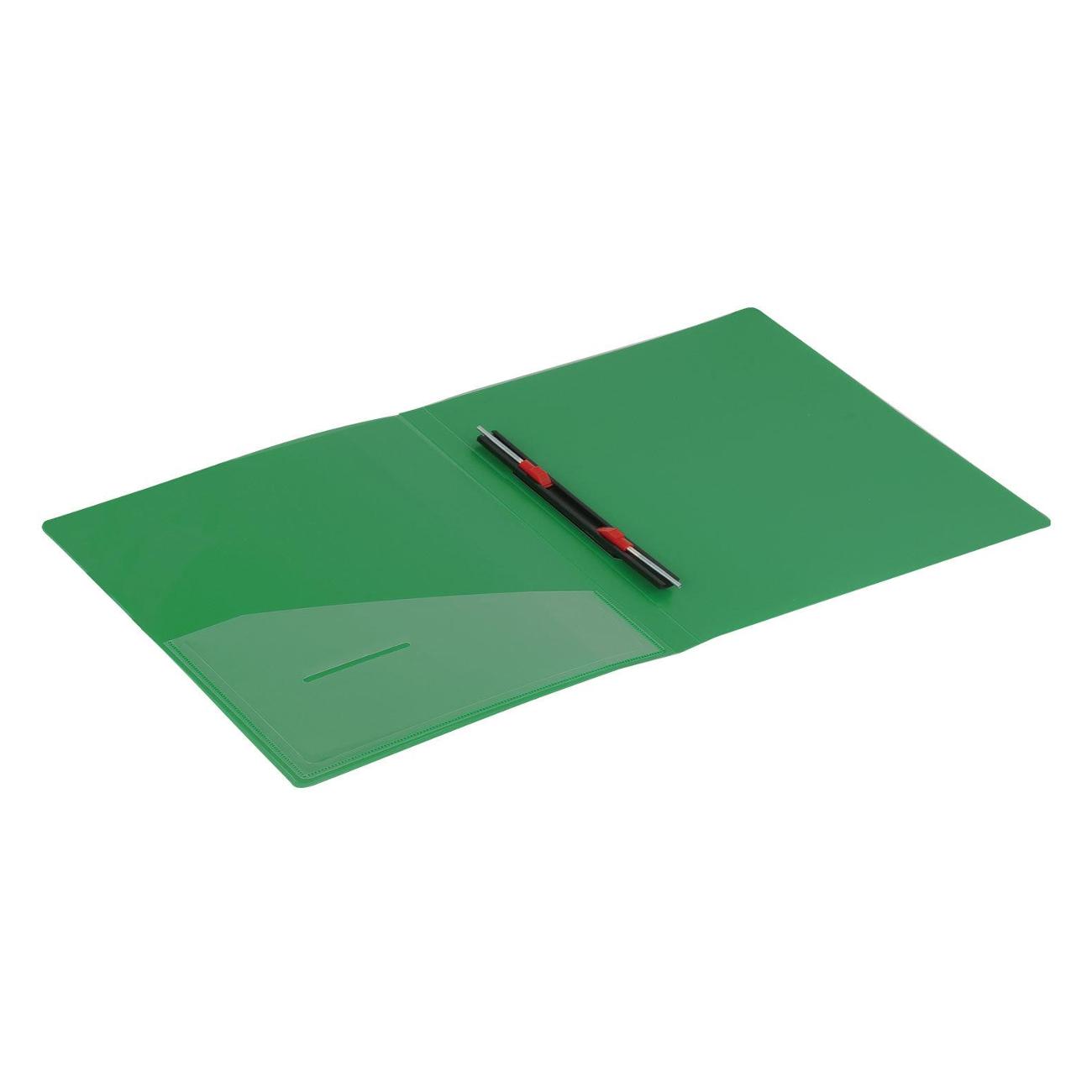 Изготовлена из высококачественного пластика зеленого цвета толщиной 0,7 мм с оригинальной линейной фактурой. Обеспечивает хранение до 100 листов формата А4. Металлический скоросшиватель с пружинным механизмом обеспечит надежную фиксацию документов. Кроме того, папка снабжена прозрачным внутренним карманом. Для идентификации имеется сменный бумажный корешок. Поставляется в индивидуальной упаковке.