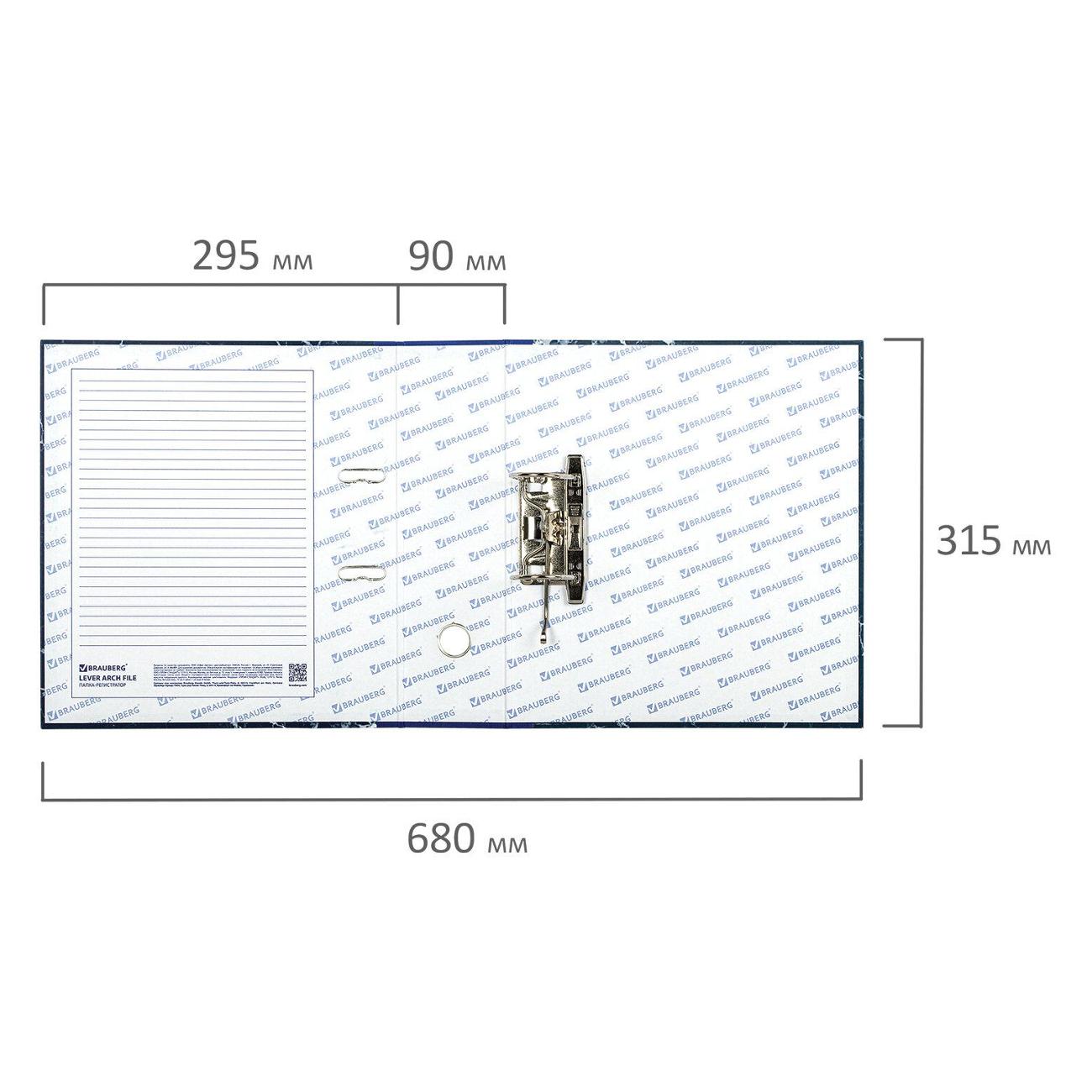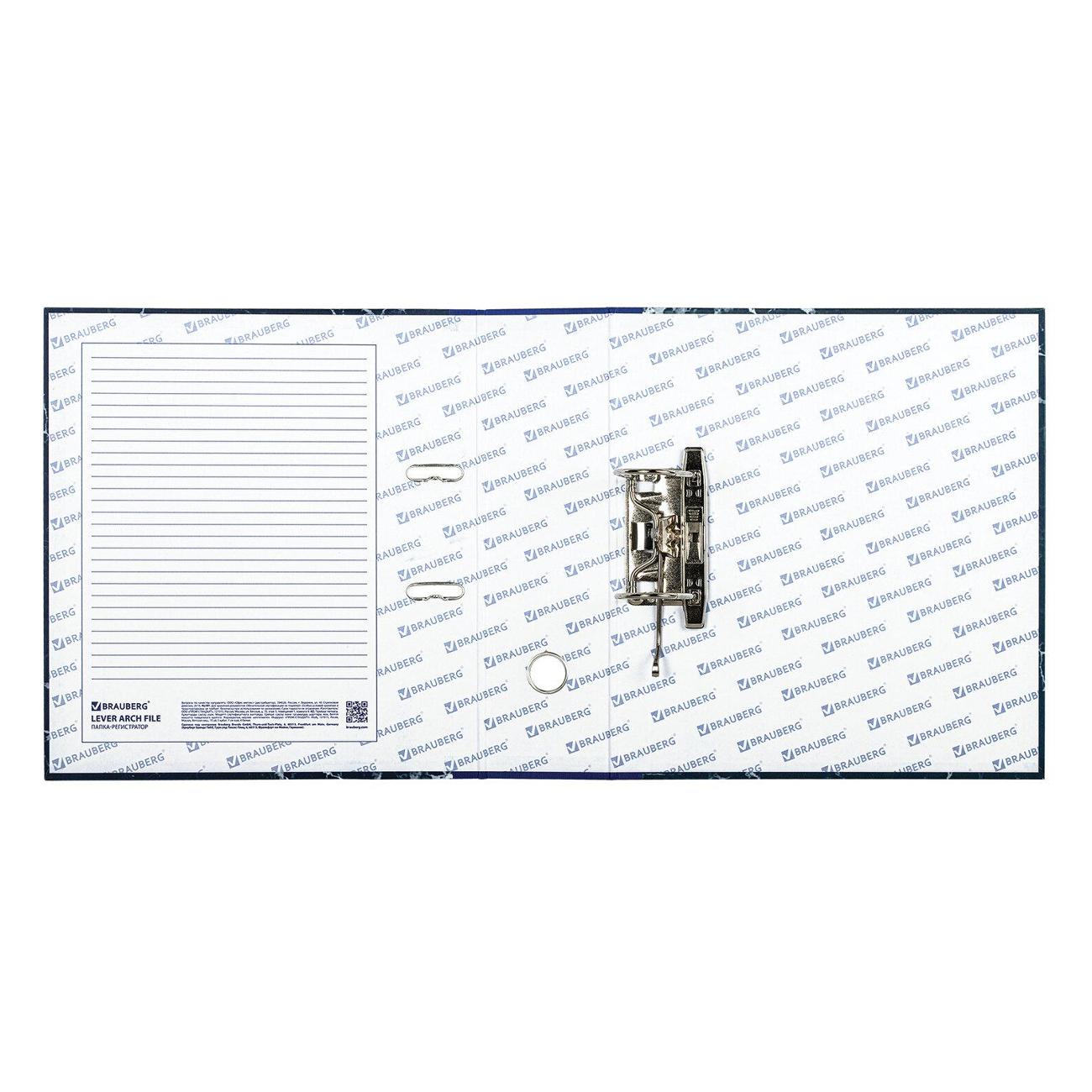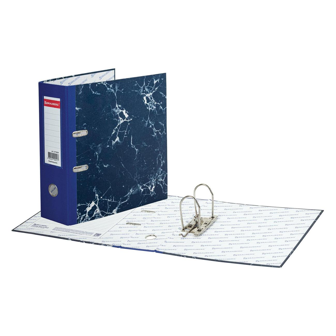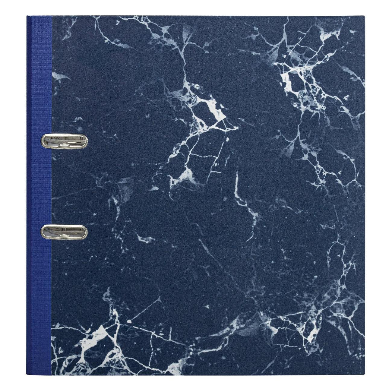 Папка формата А4 с вертикальной ориентацией изготовлена из высококачественного износоустойчивого картона с бумажным покрытием в виде синего мрамора. Ширина корешка 90 мм позволяет разместить до 750 листов. Прорези для колец на внешней крышке позволяют папке оставаться закрытой даже при большом количестве бумаг, а надежный арочный механизм легко справляется с ежедневными нагрузками.