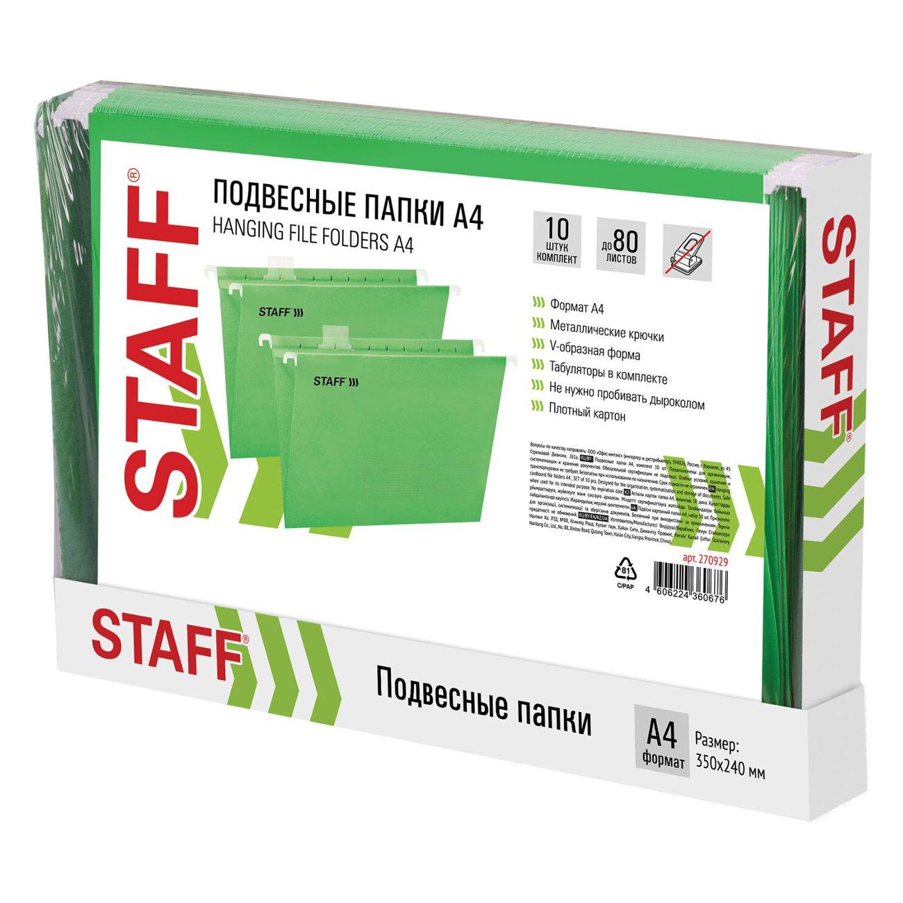 Папки V-образной формы изготовлены из высококачественного картона зеленого цвета плотностью 195 г/м2 и металлических крючков. Обладают повышенной прочностью. Вместимость до 80 листов. Размер папки без крючков составляет 310х240 мм, а с крючками - 350х240 мм. В комплект входят 10 папок, а также 10 прозрачных пластиковых табуляторов с ярлычками.