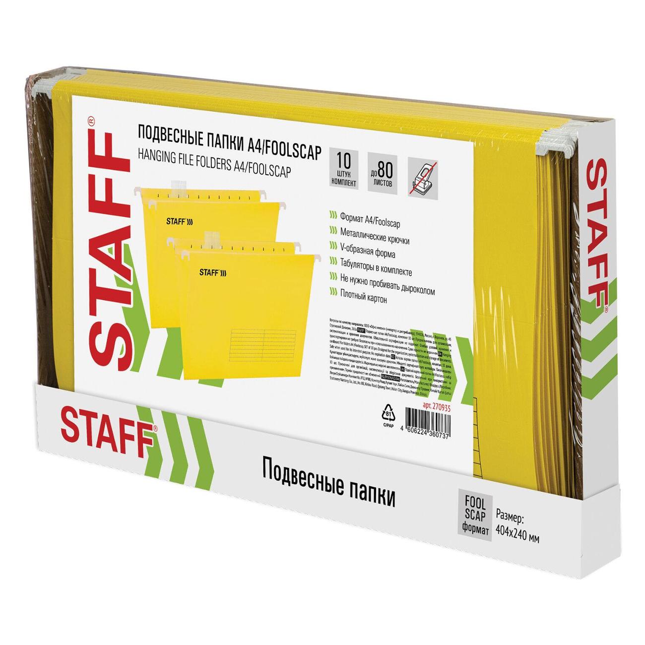 Папки V-образной формы изготовлены из высококачественного картона желтого цвета плотностью 195 г/м2 и обладают повышенной прочностью. Вмещают до 80 листов. Размер папки без крючков составляет 364х240 мм, с крючками - 404х240 мм. В комплект входят 10 папок, а также 10 прозрачных пластиковых табуляторов с ярлычками.
