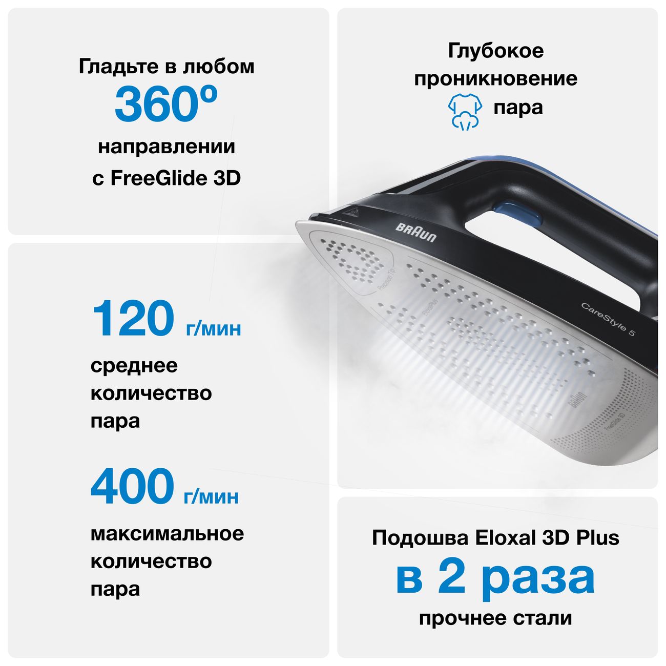 Подошва Eloxal 3D Plus имитирует форму сноуборда – её задняя поверхность слегка приподнята. Она плавно скользит абсолютно в любом направлении. Специальное покрытие отличается высокой прочностью и устойчивостью к появлению царапин. А функция «Вертикальное отпаривание» позволит привести в порядок одежду прямо на вешалке или освежить шторы, не снимая их с карниза.