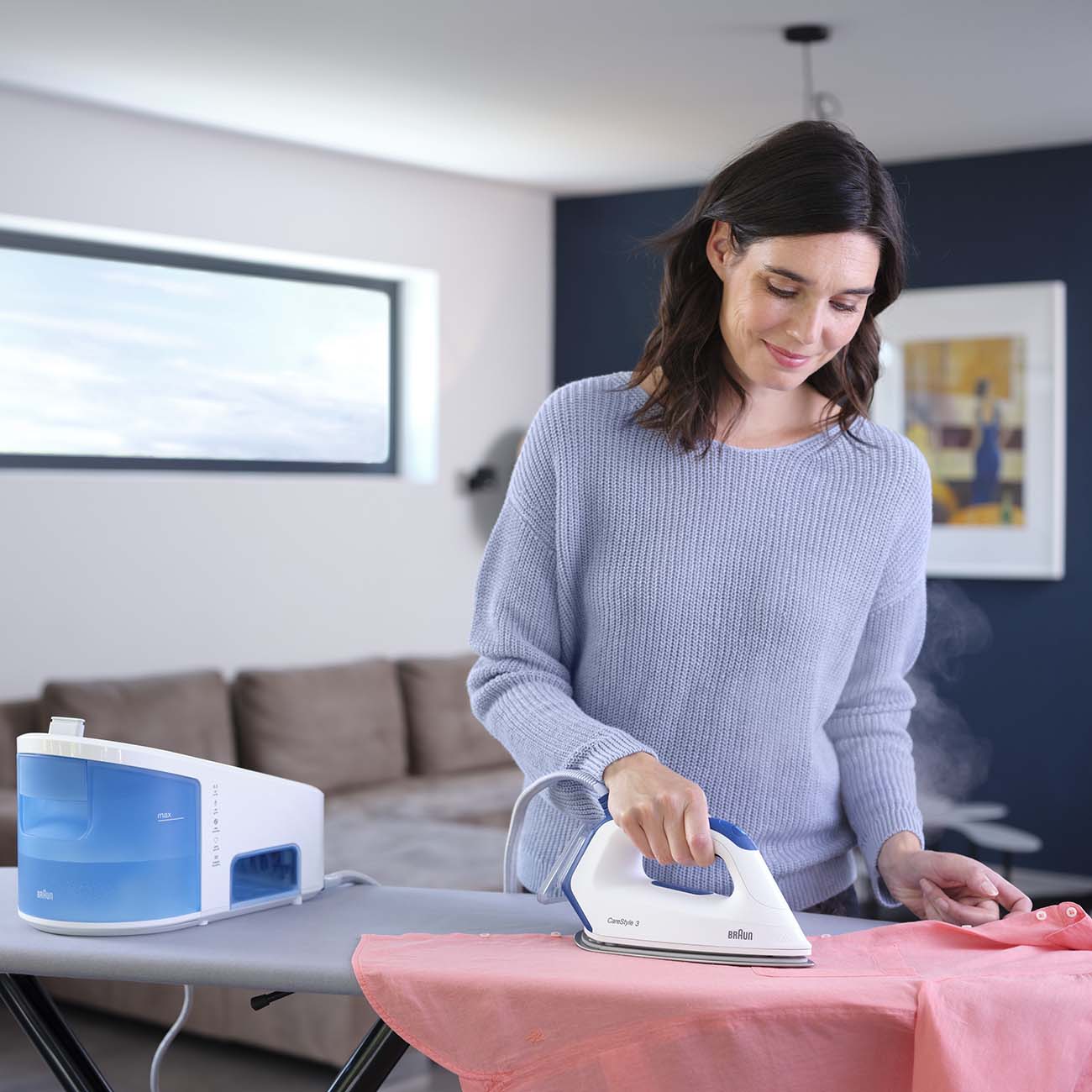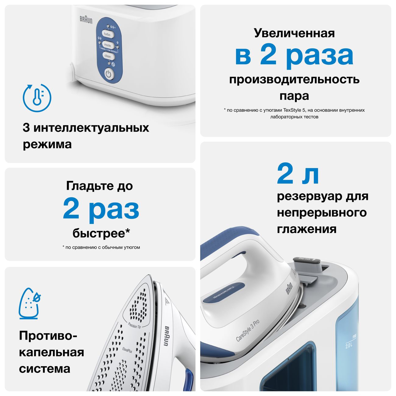 Не плохой парогенератор в своей ценовой категории. Braun зарекомендовал себя как надежный производитель техники. Данный парогенератор является безбойлерным и это с моей точки зрения самый главный минус. Итак: резервуар для воды съемный и достаточно вместительный, можно перегладить целую кучу белья на одной заливке. Шнур питания и шланг подачи воды длинные, удобно прячутся в специальные ниши в базе станции. Сам утюг маленький и легкий и это является и плюсом и минусом одновременно. С одной стороны маленьким утюжком нужно больше движений чтоб прогладить большую простынь например, но с тоже время рука меньше устает, особенно при вертикальной глажке. Подошва утюга алюминиевая с каким-то покрытием, скользит легко. Регулировка температуры и подачи пара автоматическая и это как раз не понравилось. При включении парогенератор переходит в автоматический режим, реклама и описание товара обещает автоматическую подстройку температура подошвы утюга и подачи пара. При замере температура подошвы всегда стабильна и составляет 130 градусов, что соответствует положению между единичкой и двойкой. Количество пара среднее (чуть больше чем у моего старого утюга), иногда больше иногда меньше, закономерность выявить не удалось. Чтобы подать пар нужно держать кнопку под ручкой утюга, она легкая и мне затруднений не доставила. Инструкция очень скудная, чтоб разобраться во всех режимах пришлось читать и смотреть обзоры данной модели. Есть эко режим, нажать кнопку mode с одним паром, температура подошвы падает, количество пара еще меньше, позиционируется как режим для деликатных и тонких тканей. Паровой удар активируется двойным нажатием кнопки подачи пара под ручкой утюга. ВАЖНО сразу отпустить кнопку. Вертикальное отпаривание: нажать на 2 сек кнопку mode. Главный минус что при вертикальном режиме и режиме турбо пар идет РЫВКАМИ, это обусловлено безбойлерной конструкцией парогенератора. Эффекта ВАУ к сожалению не произошло. Чуть лучше моего утюга с 20летней историей