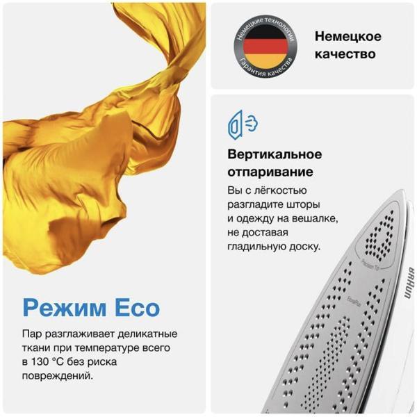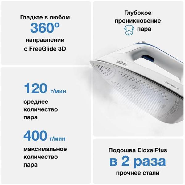 Объем съемного резервуара для воды — 2 л, его можно пополнять во время глажки. Подошва утюга 3D Eloxal Plus сделана из анодированного алюминия. Есть функция контроля оптимальной температуры, режим энергосбережения, индикация включения, готовности к работе, уровня воды и необходимости очистки от накипи.
