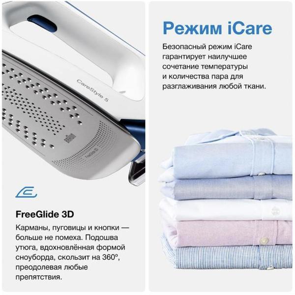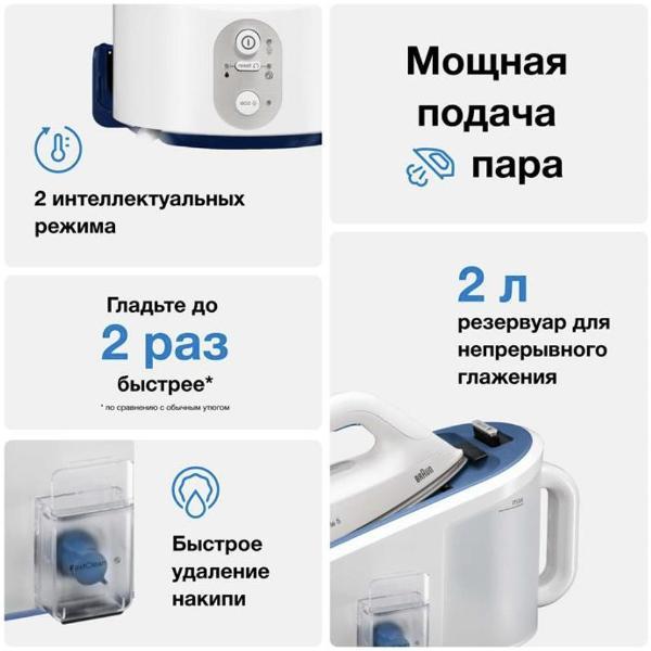 Потребляемая мощность парогенератора Braun IS5145WH — 2400 Вт. Он подает пар под давлением до 6,8 Бар с интенсивностью до 120 г/мин. Предусмотрен паровой удар силой 400 г. Время нагрева — не более 2 минут.