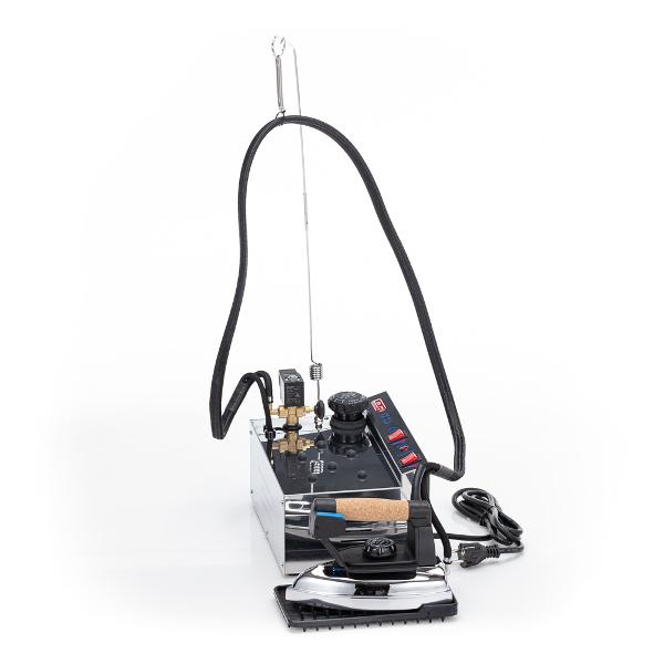 Количество пара и температура утюга регулируются — датчик давления и специальный клапан позволяют избежать превышения нужных показателей. Интенсивность подачи пара — до 120 г/мин, рабочее давление — 2,5 бар, максимальное — 5,5 бар. Ручка утюга дополнена нескользящим пробковым покрытием, подошва выполнена из алюминия. Поддерживается режим вертикального отпаривания. Потребляемая мощность — 2200 Вт, размеры — 21х21х32 см, масса прибора — 6,7 кг, утюга — 1,8 кг.