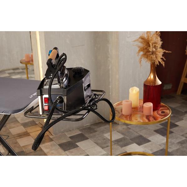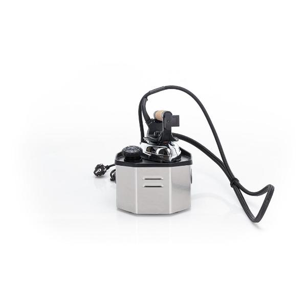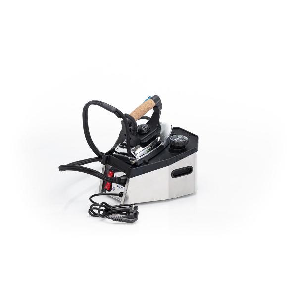 С помощью сетевого шнура устройство обеспечивается электропитанием, мощность — 2200 Вт. Необходимое время нагрева до функционирования — 7 мин. На металлическом корпусе находится индикация включения, готовности к работе и уровня воды. Подошва утюга изготовлена из алюминия. В комплектацию входит подставка. Габариты — 18х30х23 см. Общая масса — 5,7 кг.