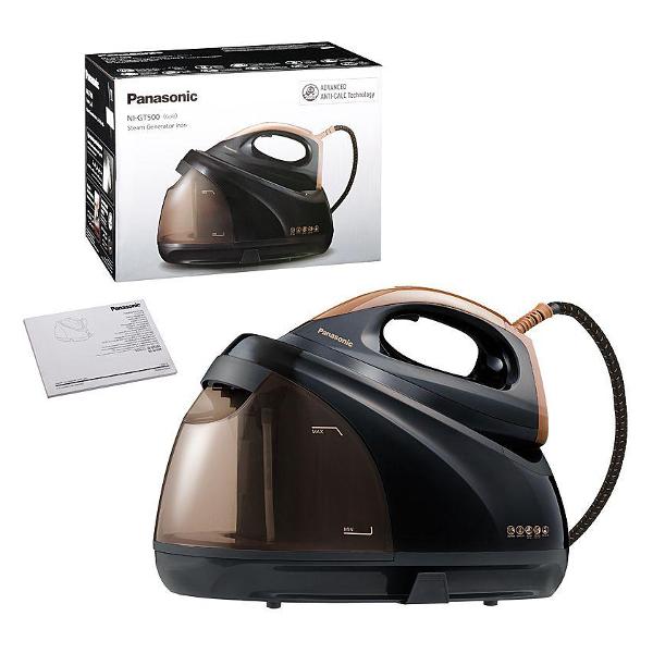 Парогенератор Panasonic NI-GT500NTW представлен в корпусе золотистой расцветки. Модель работает от электрической сети и потребляет 2400 Вт. Длина шнура — 1,8 м. Сила постоянной подачи пара составляет до 130 г/мин — предусмотрено две настройки. Давление — максимум 6,5 Бар. Для сильных складок и заломов можно воспользоваться паровым ударом — 720 г/мин. Присутствует функция вертикального отпаривания.