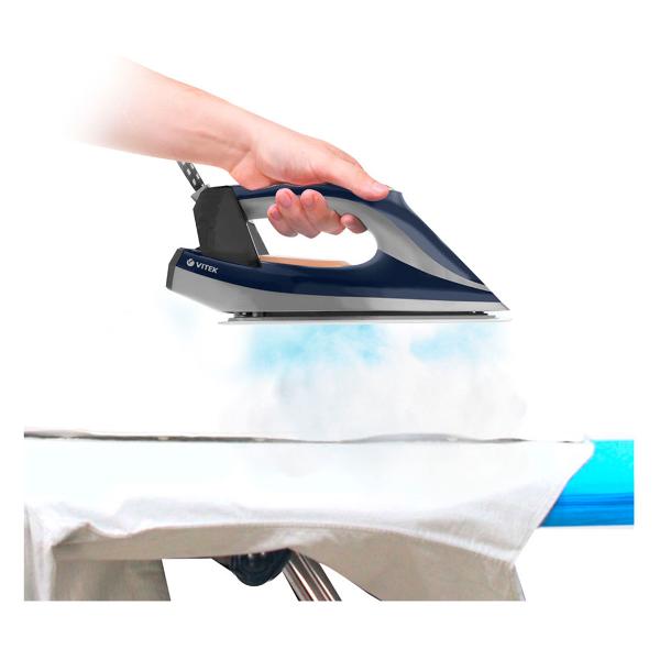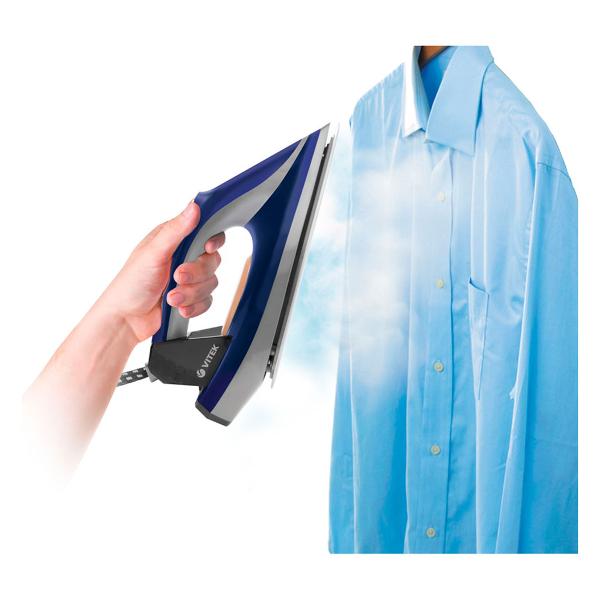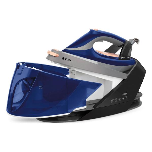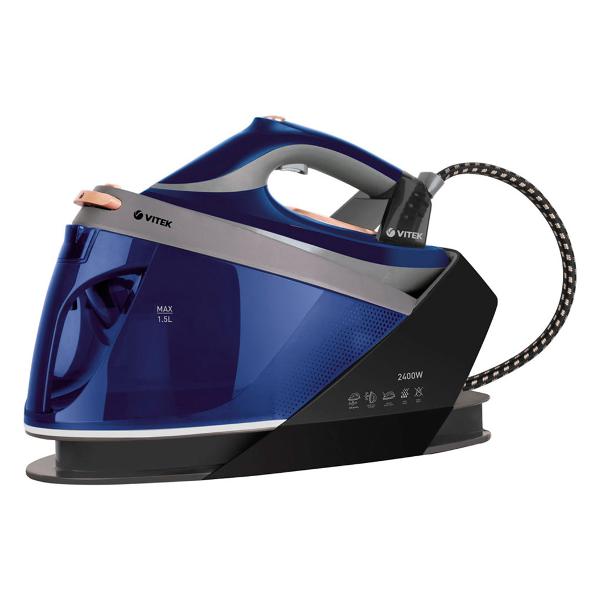 Паровая гладильная установка Vitek VT-2430 мощностью 2400 Вт позволяет гладить вещи сухим способом (можно отключить подачу пара) и отпаривать деликатные ткани и домашний текстиль. Сила парового удара составляет 220 г/мин, давление 5,5 Бар помогает разгладить даже несколько слоев ткани.