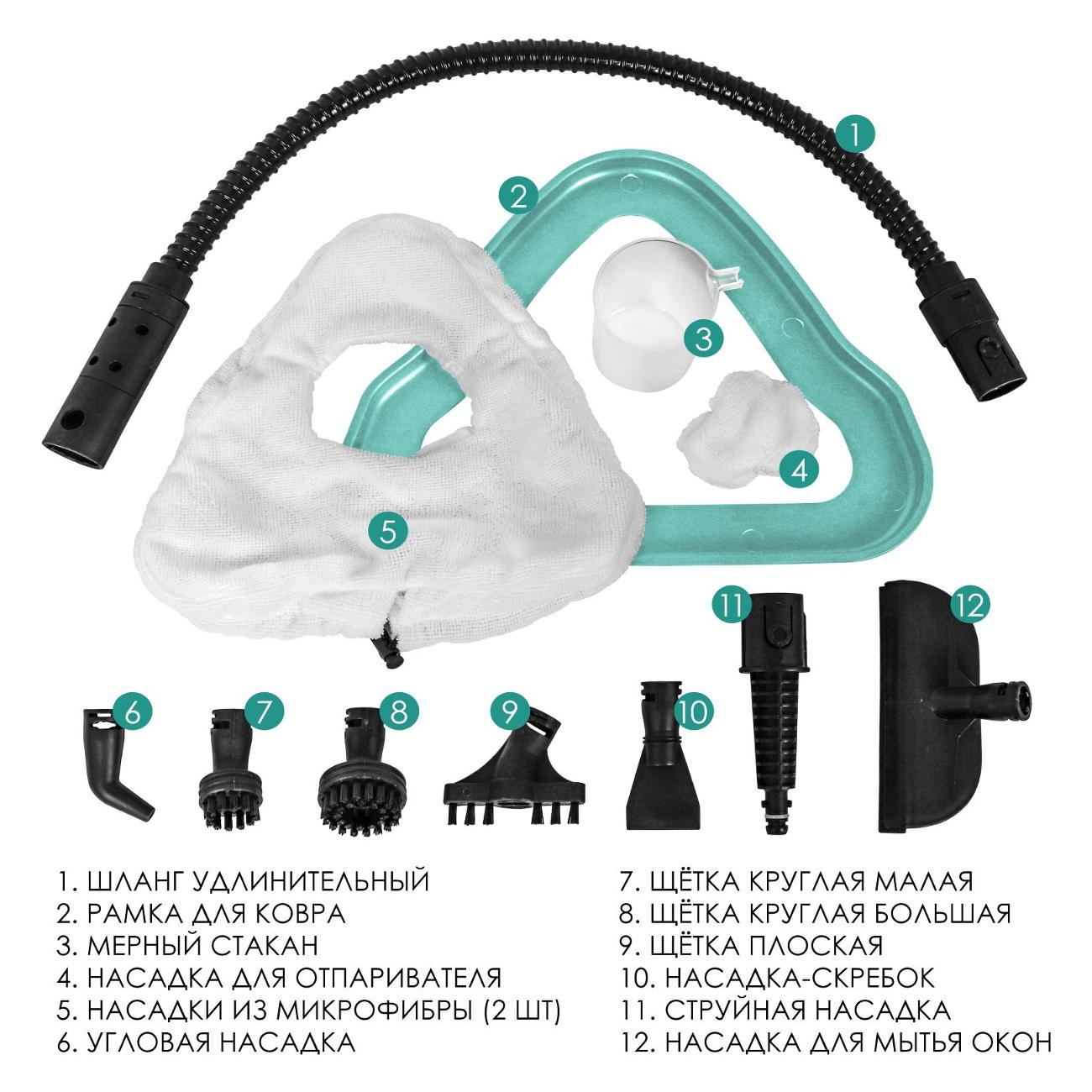 На корпусе парогенератора предусмотрен съемный ручной модуль. Пар подается под давлением 1-3 Бар — этого достаточно для удаления самых застарелых пятен. Щетка пароочистителя вращается на 180° и позволяет добраться до труднодоступных мест. Длина сетевого кабеля прибора — 5 м. В комплекте с поставляется 12 многофункциональных насадок.