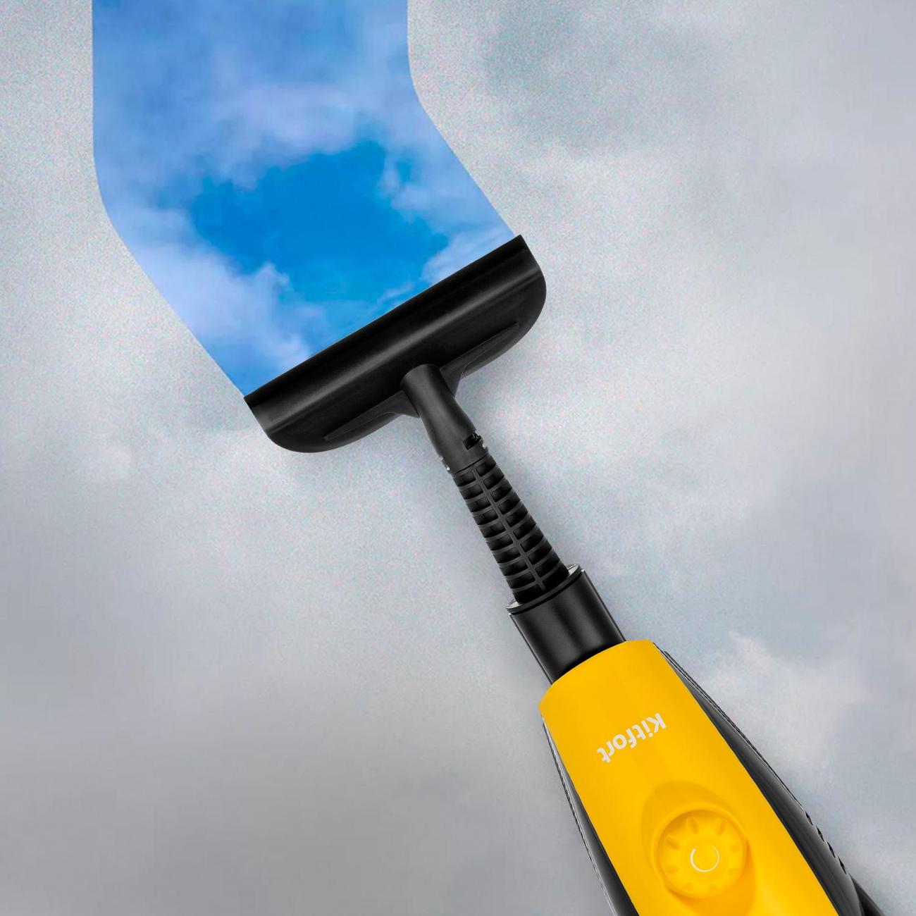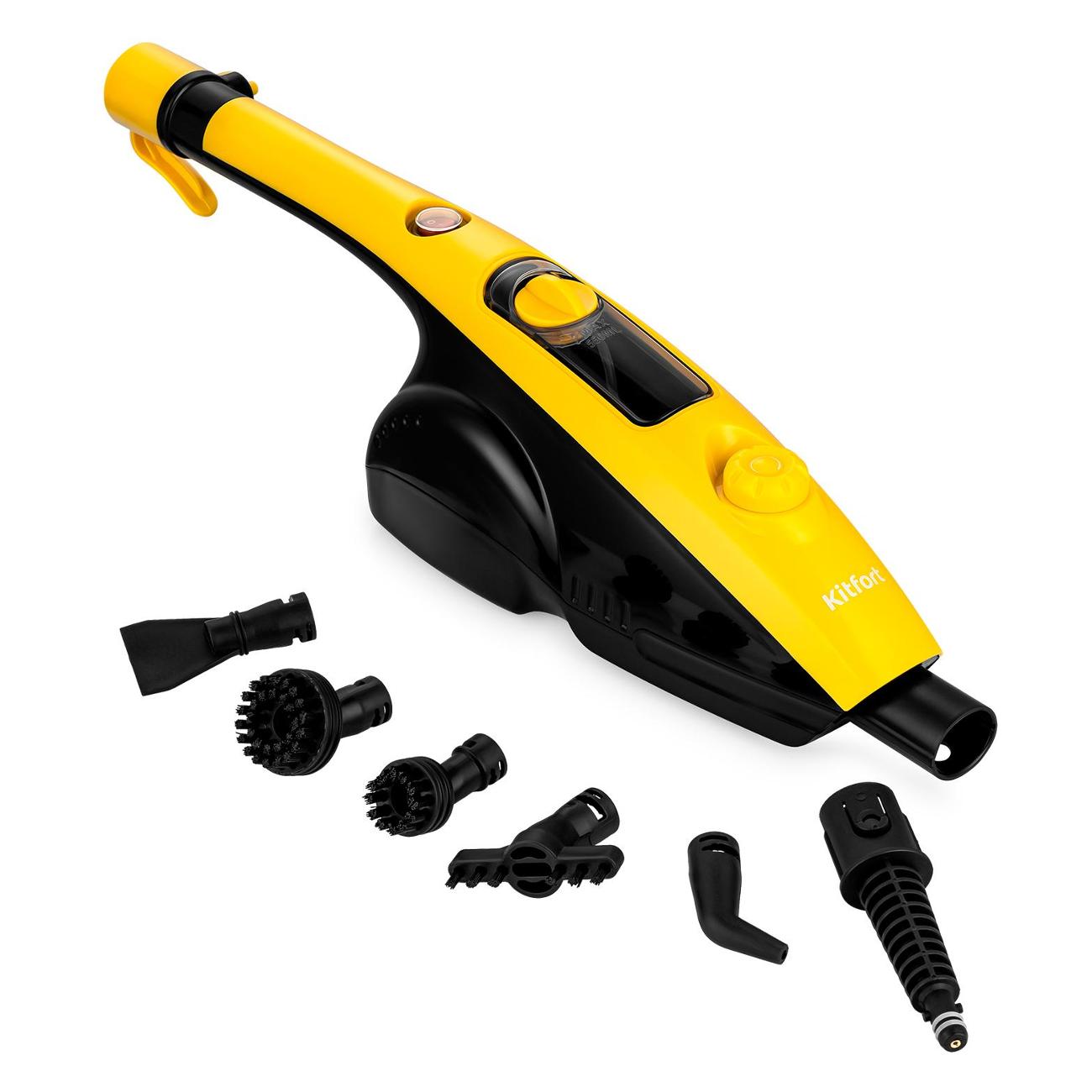 Пароочиститель Kitfort КТ-1017-3 оснащен пластиковым резервуаром, вмещающим до 0,55 л воды. В комплекте поставляются мерный стаканчик, тканевая накладка, удлинитель трубки и 10 насадок, помогающих проводить уборку пола, кафеля, ковров или труднодоступных участков, дезинфицировать поверхности. Интенсивность подачи пара регулируется до максимального показателя 28 г/мин.