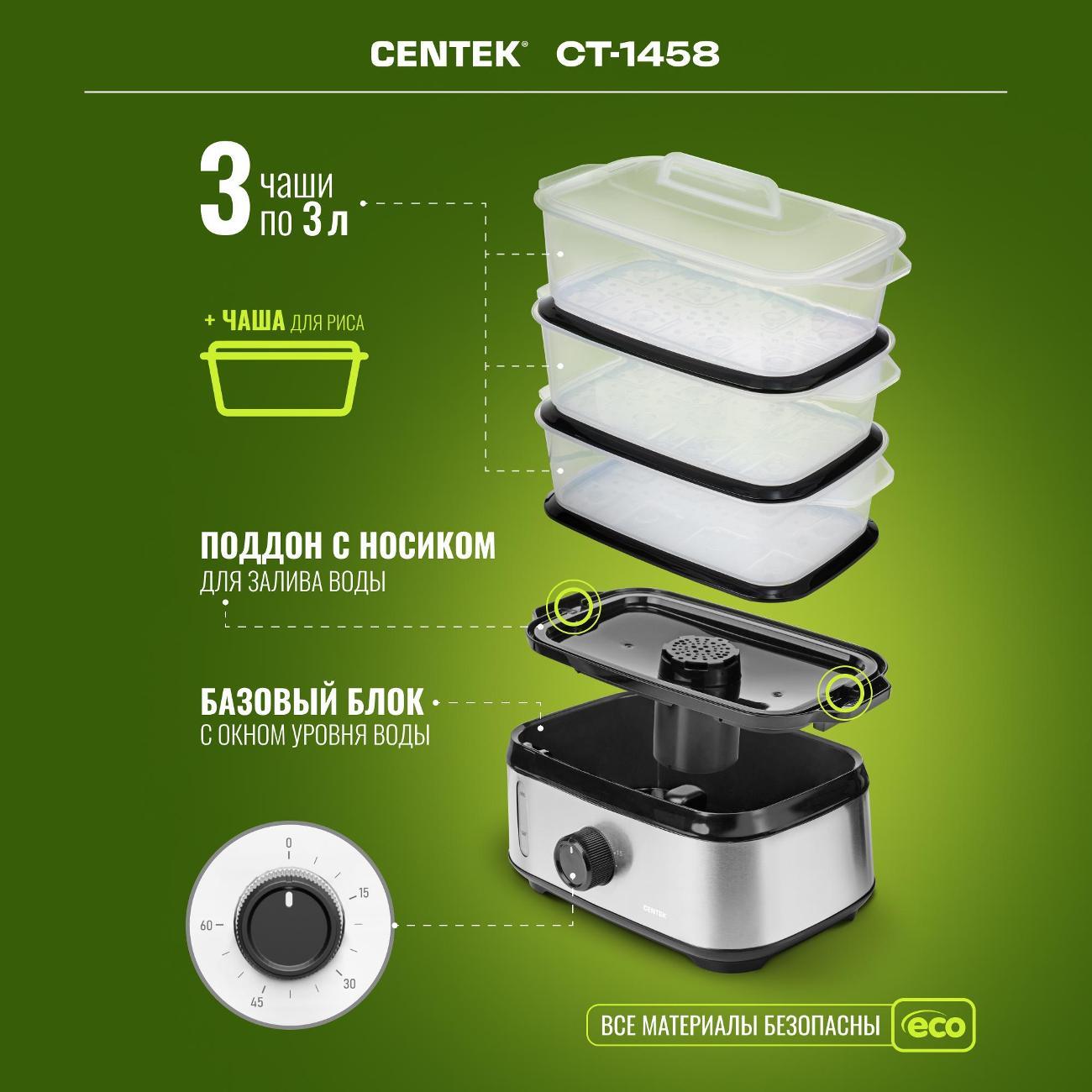 Вы можете купить Пароварка электрическая Centek CT-1458 в магазинах М.Видео по доступной цене. Пароварка электрическая Centek CT-1458: подробное описание, фото и отзывы реальных покупателей, характеристики, возможность скачать инструкции и подобрать аксессуары.