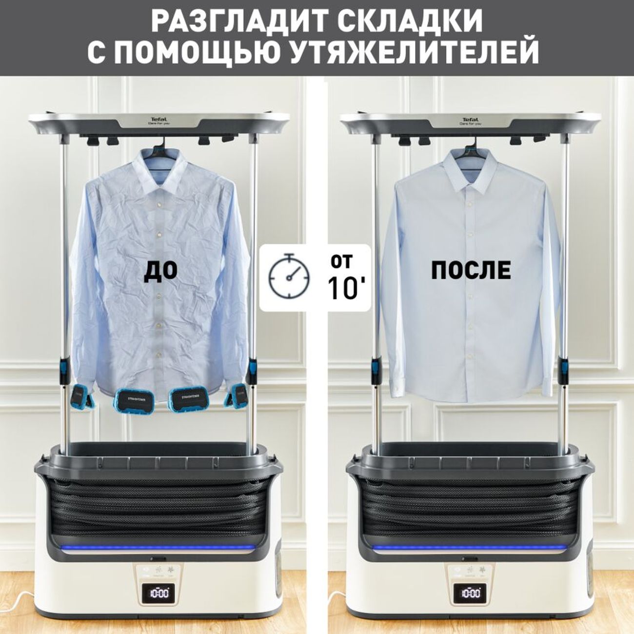 Мощный пар подаётся по всему внутреннему пространству системы и разглаживает складки на одежде быстрее, чем при использовании обычного отпаривателя. В зависимости от количества и сложности складок одновременное отпаривание трёх вещей займёт от 10 минут.