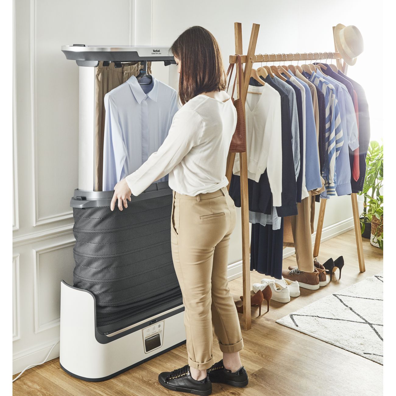Паровая система для ухода за одеждой Tefal Care For You YT3040E1 помогает ухаживать за одеждой, не прилагая усилий. В устройстве предусмотрены три режима, благодаря которым можно отпарить вещи, деликатно высушить их, а также дезинфицировать и устранить неприятные запахи.