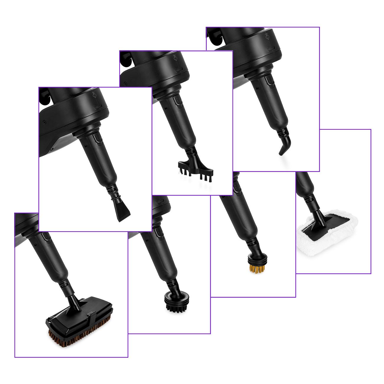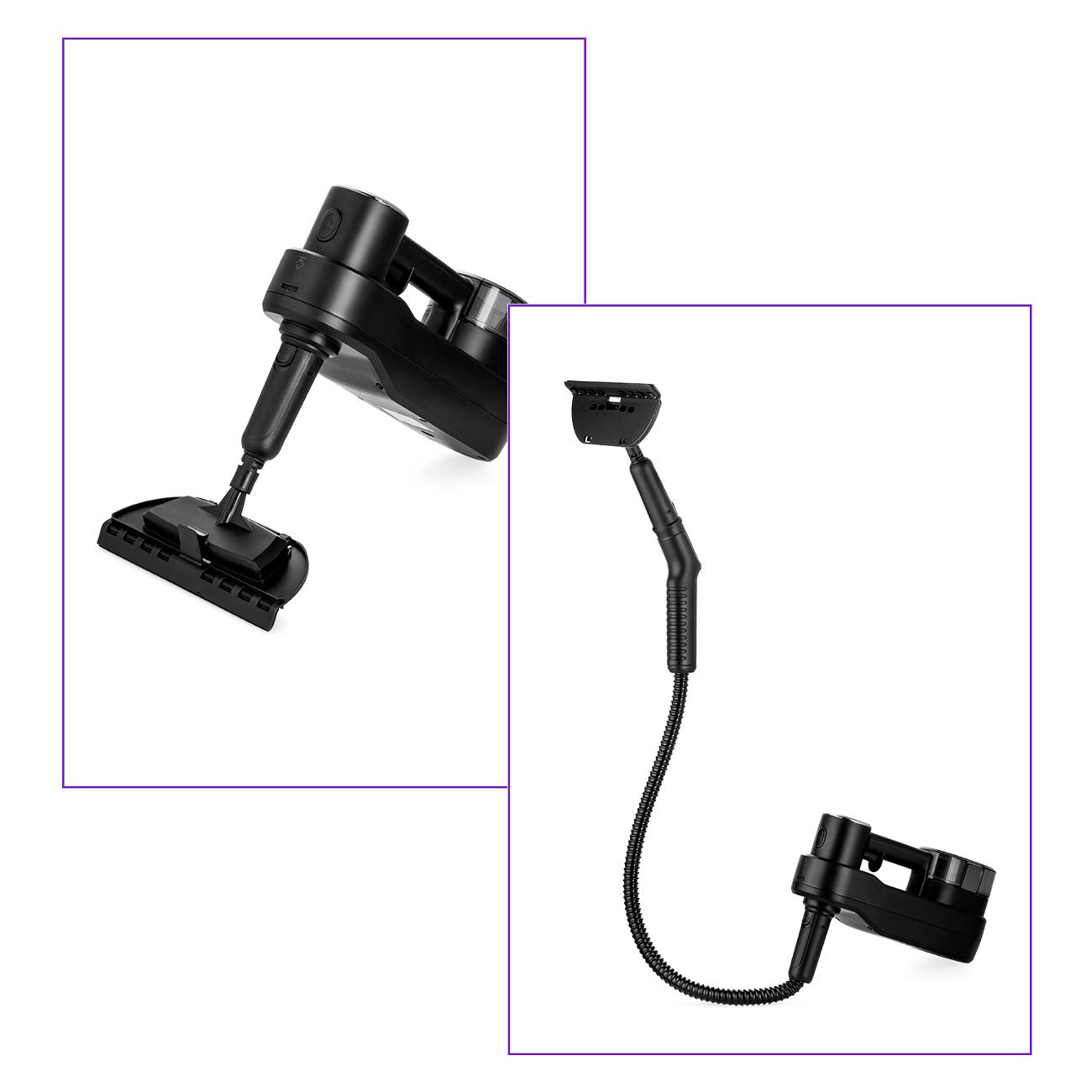 Набор поставки состоит из тканевой накладки и 12 насадок, помогающих проводить уборку труднодоступных участков, ковров, кафеля, стекол и мягкой мебели, сильнозагрязненных поверхностей. Устройство подключают к сети переменного тока с помощью кабеля длиной 5 м. Трубка изготовлена из алюминия. Цвет — черный. Размеры — 112х30х14,5 см. Вес — 3,43 кг.