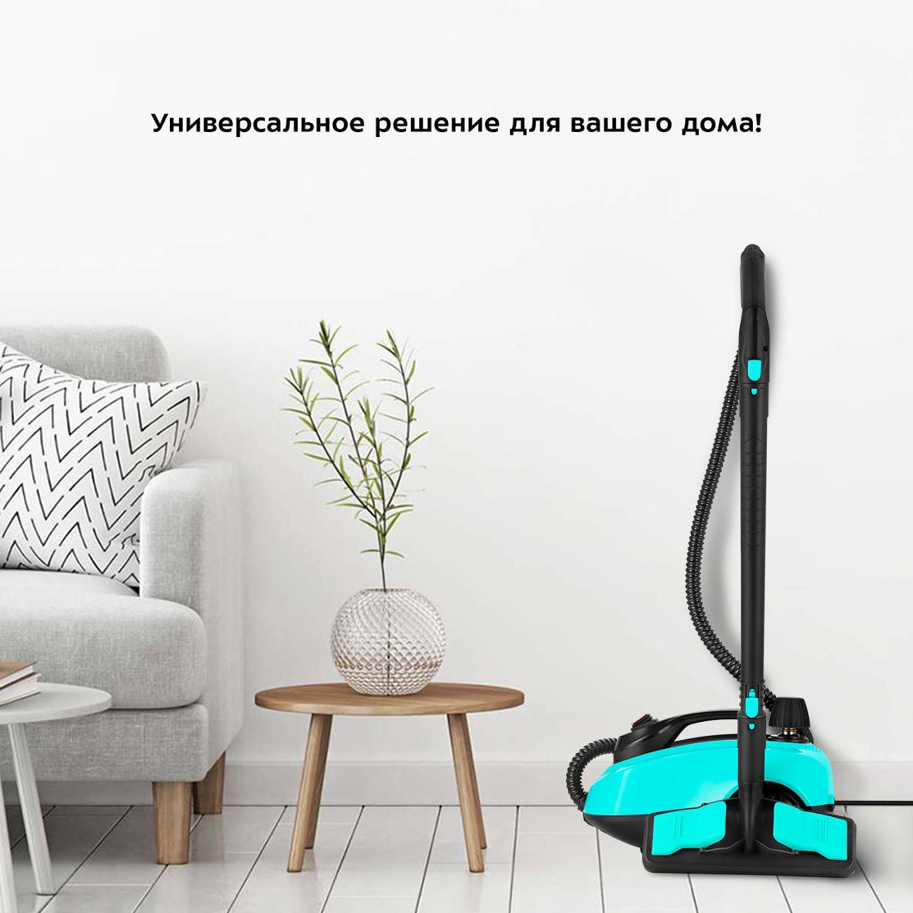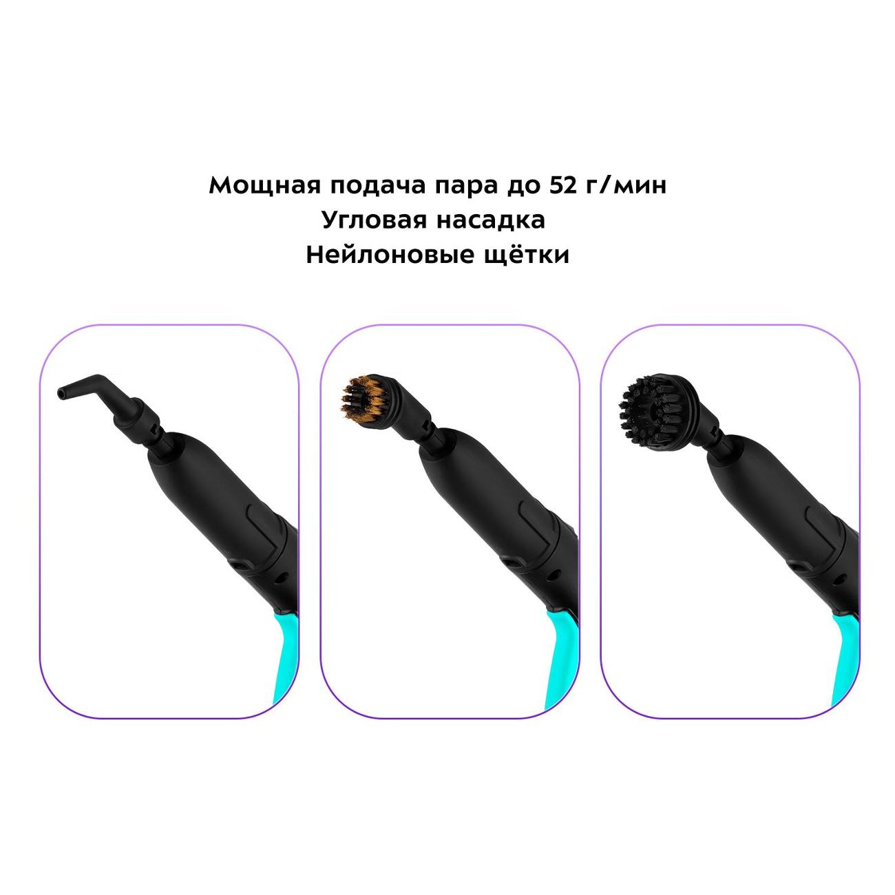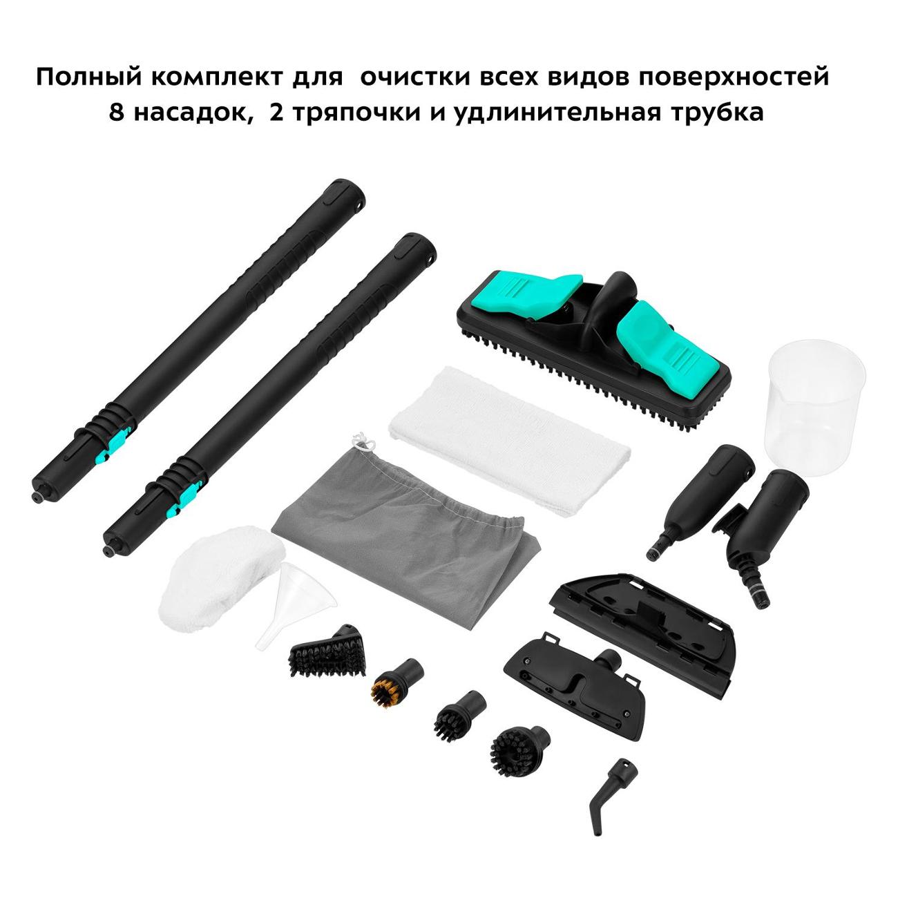 В наличии предусмотрено большое количество насадок: для мытья полов, для мойки кафеля, для отпаривания ткани, для сильных загрязнений, для чистки одежды, с щеткой, для труднодоступных мест. На черно-зеленом корпусе расположена индикация включения и готовности к работе, составная трубка. В комплектацию включены воронка, мерный стакан, удлинитель трубки. Электропитание обеспечивается от сети 220 В через провод протяженностью 2,4 м. Потребляемая мощность составляет — 1800 Вт. Габариты — 19х33,5х23,5 см. Вес — 4,5 кг.