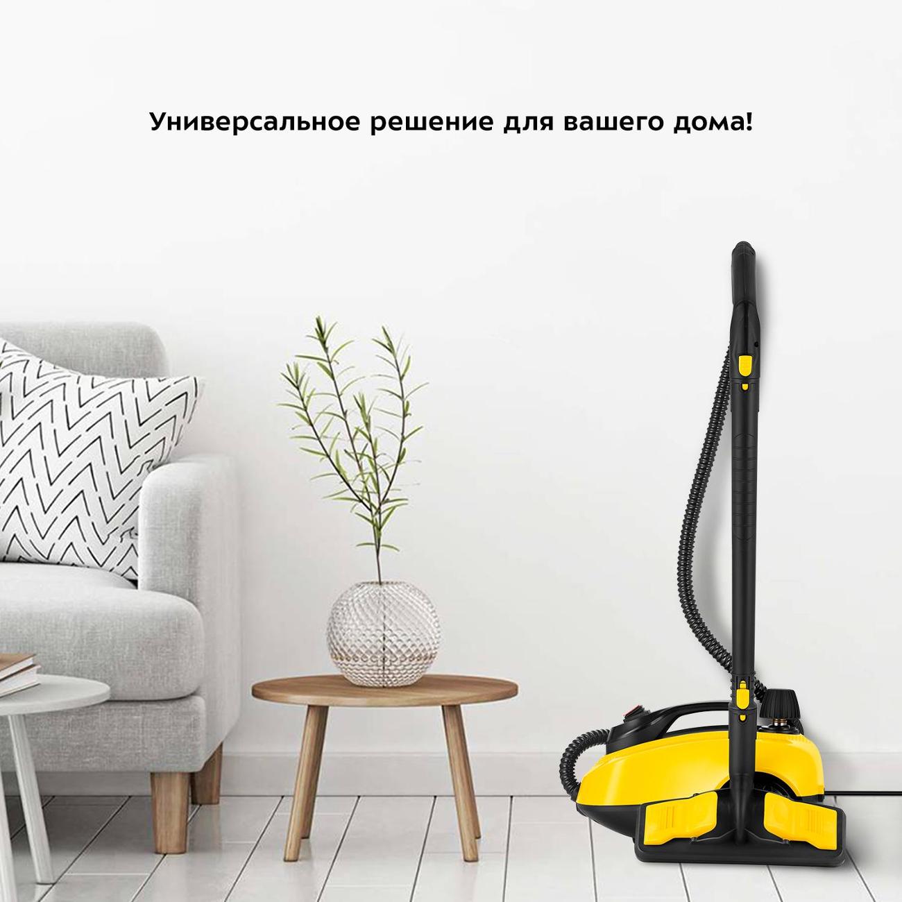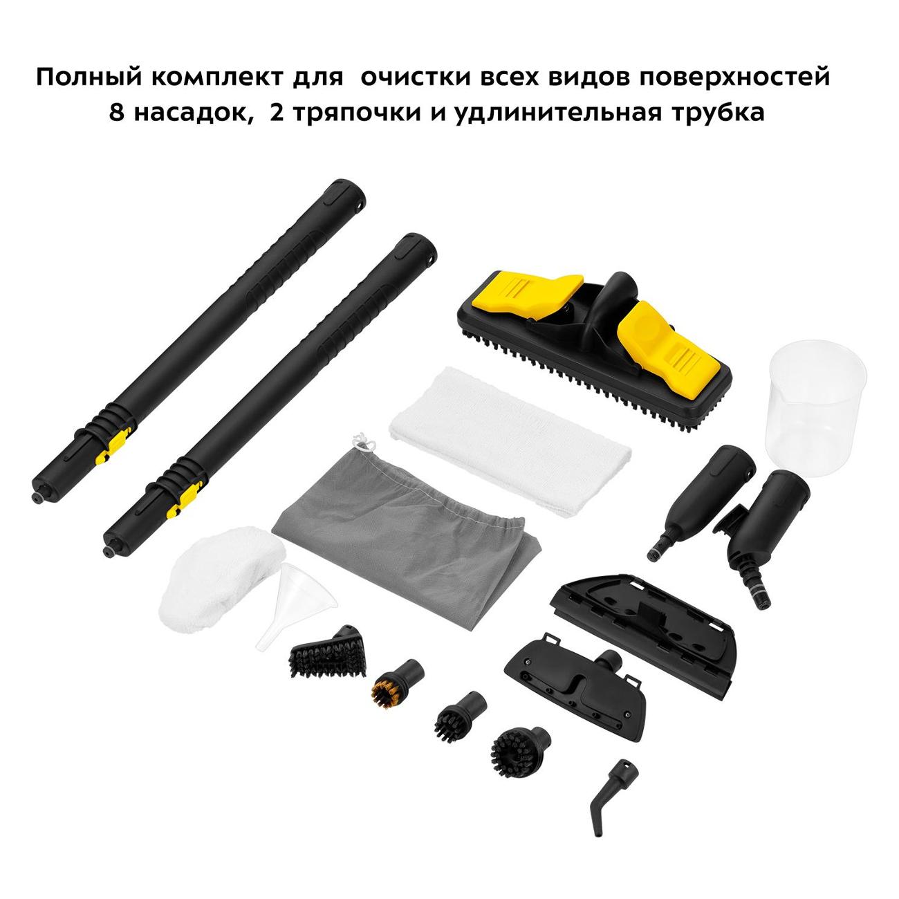 В наличии предусмотрено большое количество насадок: для мытья полов, для мойки кафеля, для отпаривания ткани, для сильных загрязнений, для чистки одежды, с щеткой, для труднодоступных мест. На черно-желтом корпусе расположена индикация включения и готовности к работе, составная трубка. В комплектацию включены воронка, мерный стакан, удлинитель трубки. Электропитание обеспечивается от сети 220 В через провод протяженностью 2,4 м. Потребляемая мощность составляет — 1800 Вт. Габариты — 19х33,5х23,5 см. Вес — 4,5 кг.