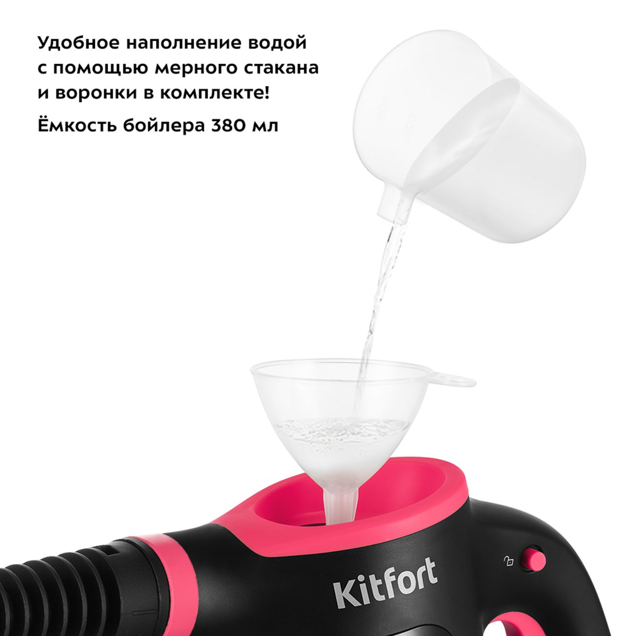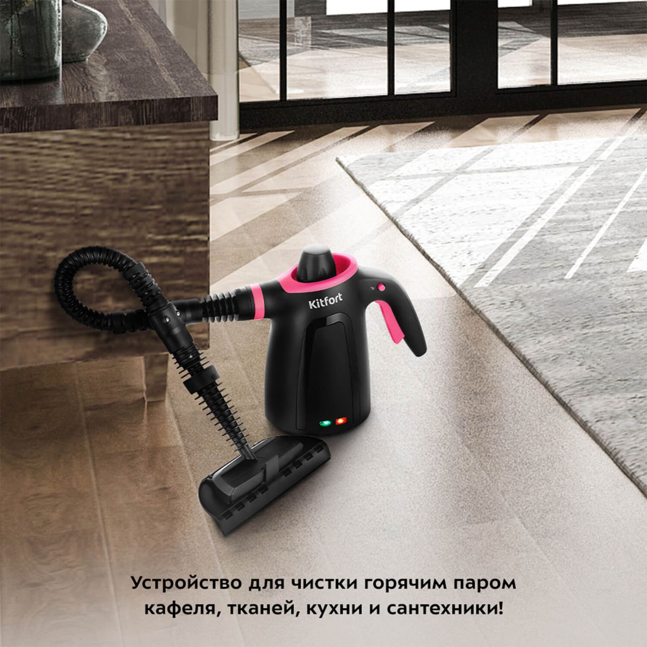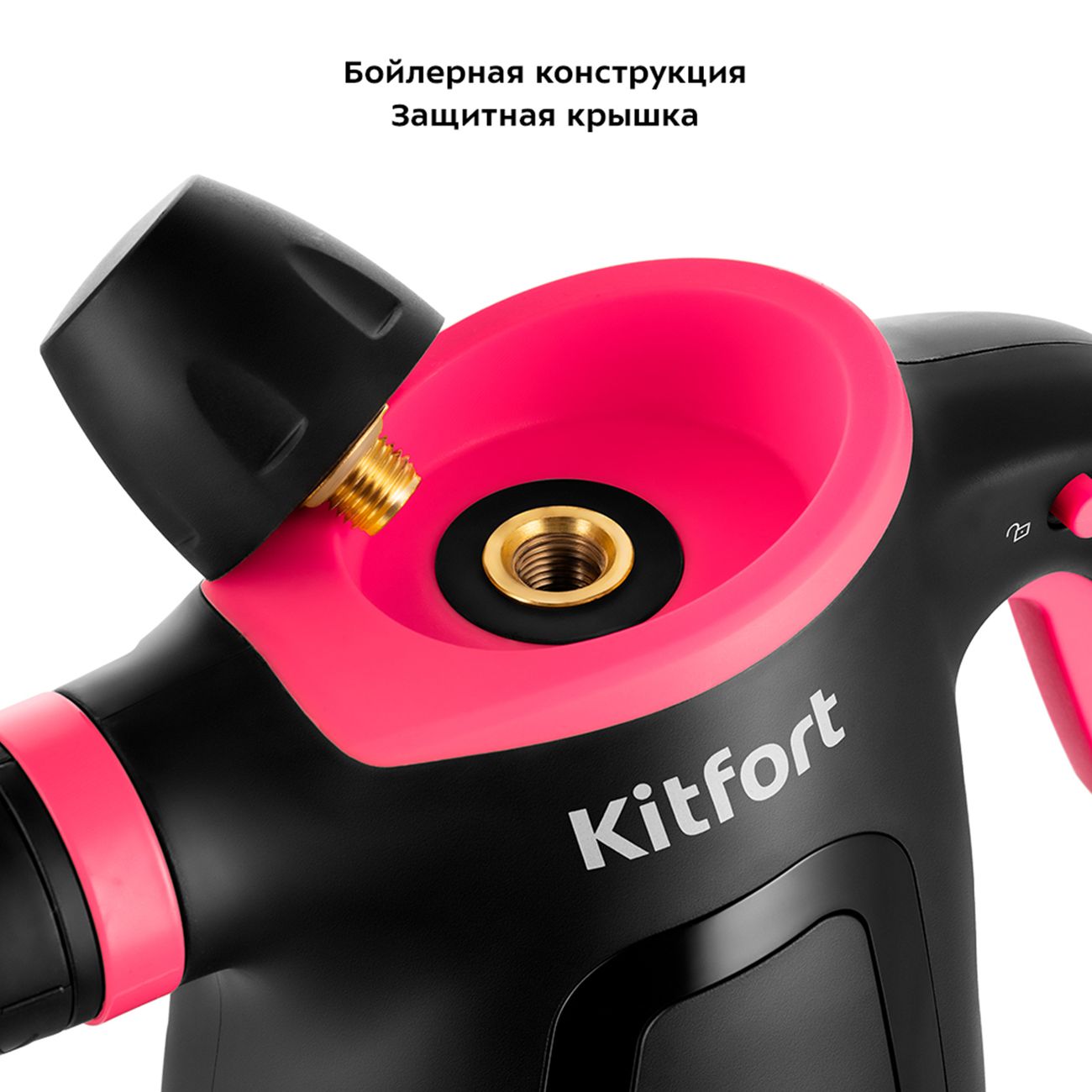 Паровой очиститель Kitfort КТ-9170-1 мощностью 1050 Вт работает с максимальным давлением 3,5 Бар. Управление кнопочное. Подача пара (до 30 г/мин) происходит путем перемещения предохранителя в открытое положение, после этого удерживается кнопка. Объем резервуара для воды равен 0,38 л. Бойлер выполнен из алюминия. Для безопасного использования прибора установлена защита от случайного включения подачи пара.