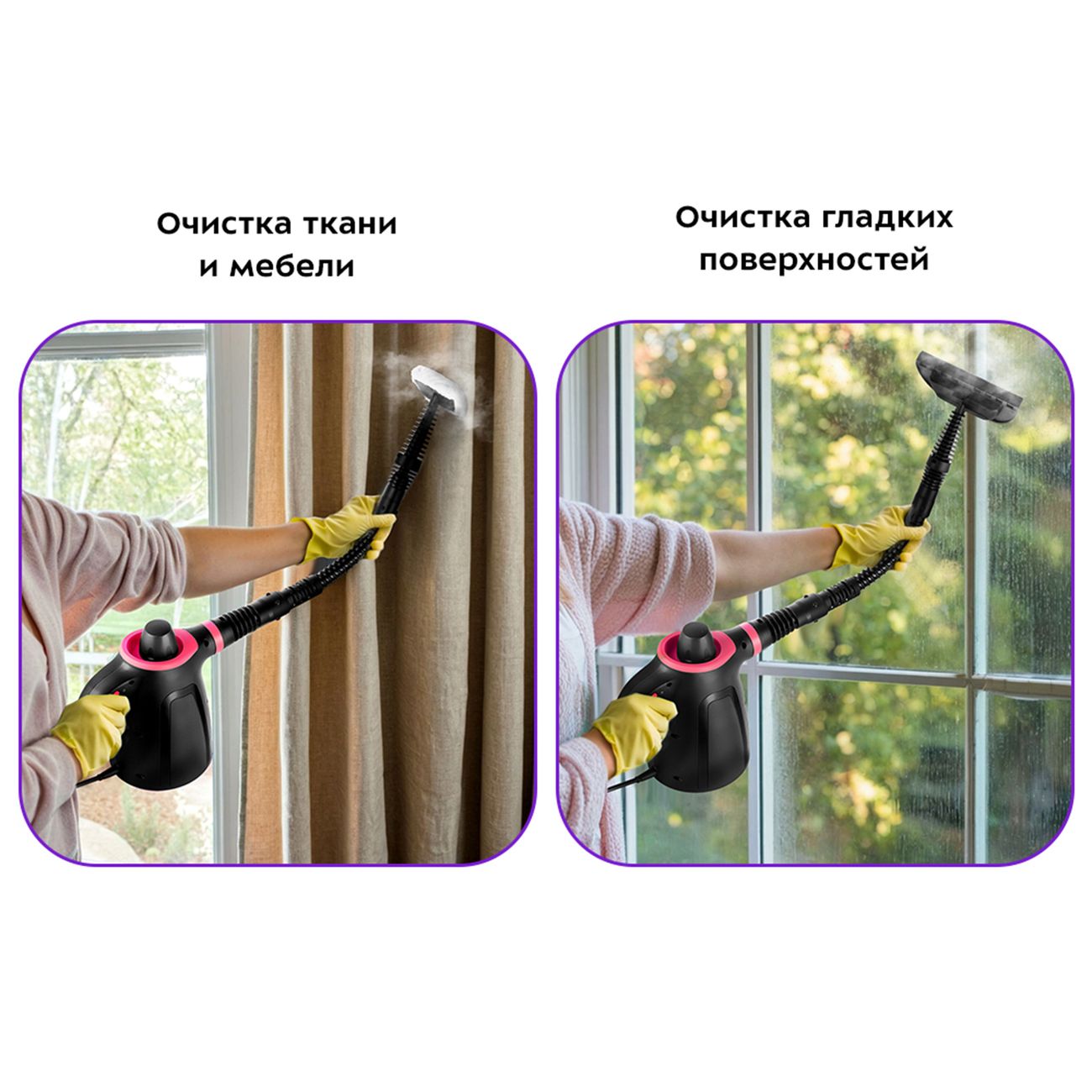 Семь насадок, входящих в комплект, подходят под любой тип загрязнения, позволяют проводить уборку без использования чистящих средств. Дополнена комплектация удлинительным шлангом, воронкой и мерным стаканом. На корпусе встроены индикаторы питания и готовности пара. Цвета корпуса модели — черный/малиновый. Габариты — 23х28,5х13 см. Вес равен 1,6 кг.