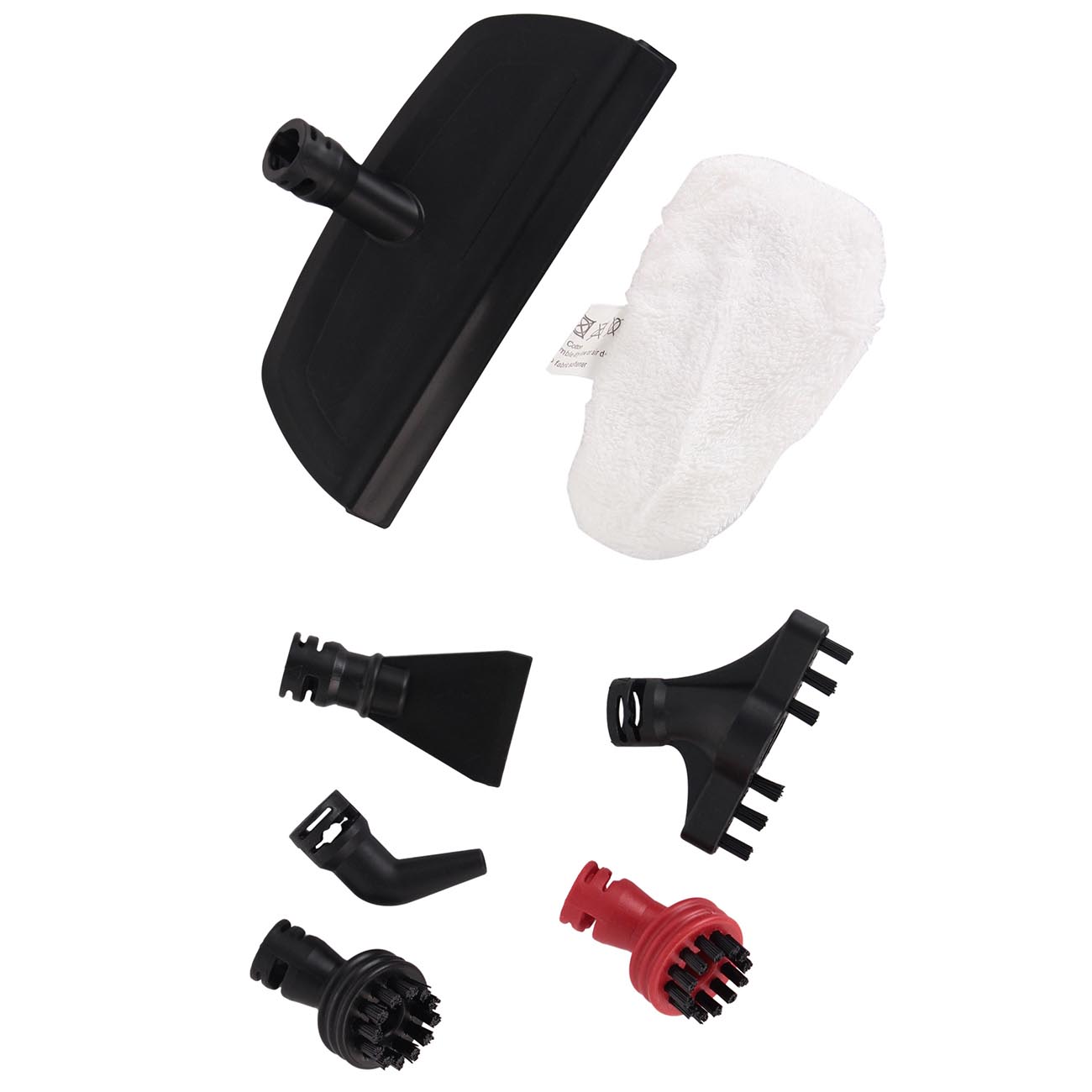 В комплект входит семь насадок. С их помощью можно ухаживать за столешницами и дверными ручками, окнами и зеркалами, шторами и другими изделиями из тканей.