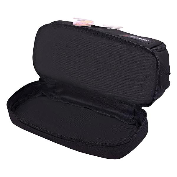 Выполнен из прочного полиэстера с эффектом soft-touch. Пенал имеет одно основное отделение с застежкой-молнией, а также дополнительное отделение в нижней части с застежкой молнией-вокруг, обеспечивающее удобный доступ к канцелярии. Также пенал оснащен откидной планкой с двойным кармашком из сеточки и органайзером для 5 предметов. Сбоку расположена ручка для переноски.