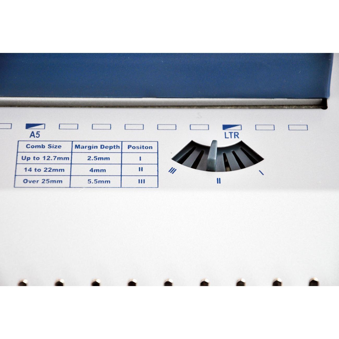CB-240e – переплетная машина на пластиковую пружину c возможностью отключения всех пуансонов для работы с нестандартными, дизайнерскими форматами бумаги. Это мощный брошюровщик с электрическим приводом механизма перфорации бумаги на 25 листов, переплетающий до 500 листов бумаги на пружину 51 мм. Для удобства работы механизм раскрытия пружины расположен внизу и спереди машины, что упрощает переплет брошюр с большим количеством листов. Для перфорации листов бумаги формата А3 в машине есть специальный фиксатор для сохранения шага пробиваемых отверстий. Характеристики: Максимальная толщина переплета – до 500 листов (бумага 80 гр/м2); Максимальный диаметр пружины - 51 мм; Максимальная мощность дырокола – до 25 листов (бумага 80 гр/м2); Перфорация – вертикальная, есть держатель бумаги; Тип перфорации - электрический; Определитель размера пружины; Регулятор формата листа: А3, В4 – 24 отверстия, А4 - 21 отверстие; Специальный фиксатор для сохранения шага пробиваемых отверстий (пробивает 47 отверстий на большом формате); 3 режима (4, 5, 7 мм) отступа от края листа до центра пробиваемых отверстий; Отключение всех ножей; Звуковая индикация заполнения мусорного контейнера; Ножная педаль перфорации.