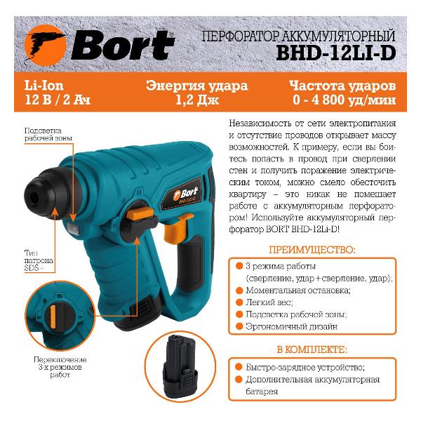 Вы можете купить Перфоратор Bort BHD-12LI-D в магазинах М.Видео по доступной цене. Перфоратор Bort BHD-12LI-D: подробное описание, фото и отзывы реальных покупателей, характеристики, возможность скачать инструкции и подобрать аксессуары.