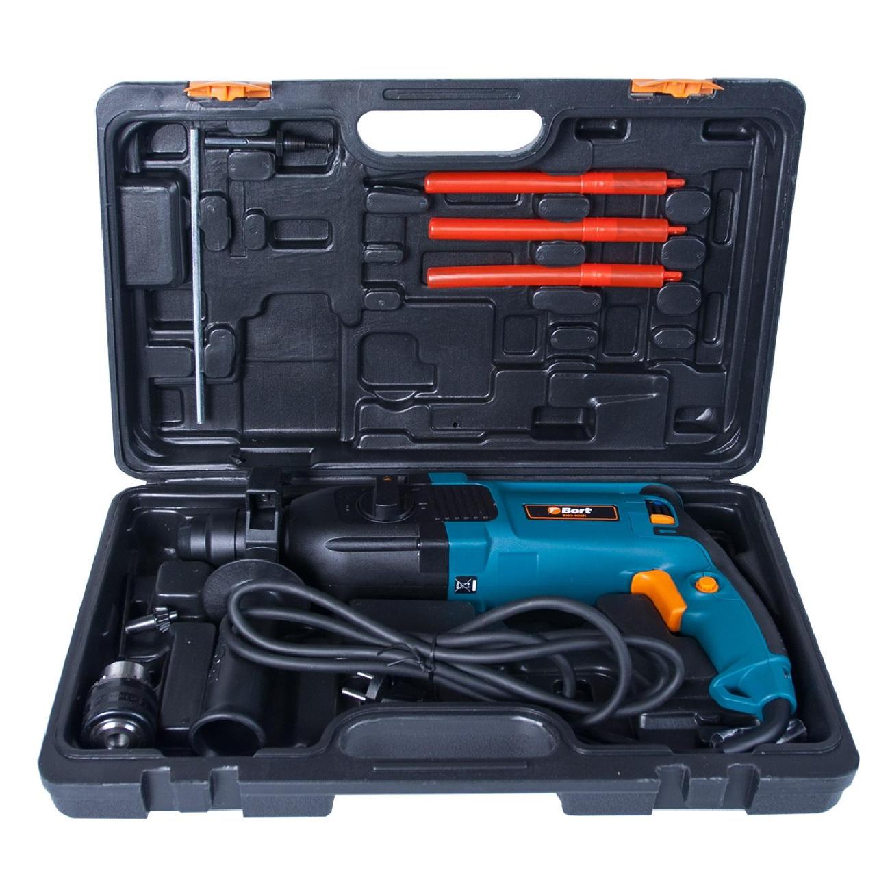 Перфоратор Bort BHD-800N полупрофессионального типа предполагает работу с материалами разного типа, в том числе с бетоном, в трех режимах: сверление, сверление с ударом, долбление. Встроена функция реверса. Диаметр бура составляет 26 мм. Максимальная энергия удара — 3 Дж. Встроен электромеханический ударный механизм. Диаметр сверления регулируется: 30 мм — для дерева, 26 мм — для бетона и камня, 13 мм — для металла. В режиме долбления инструмент способен выполнять 5000 ударов в минуту.