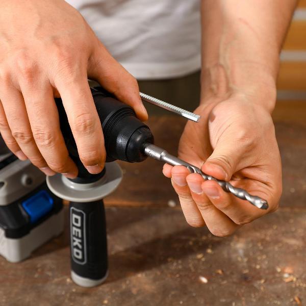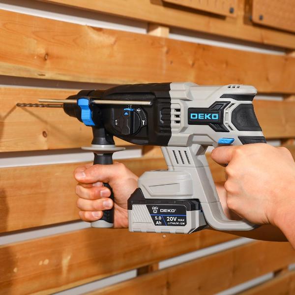 Перфоратор Deko DKCH20FU-Li оснащен ограничителем глубины, системой быстрой замены патрона и электронной регулировкой частоты вращения. Источником питания выступает съемный литий-ионный аккумулятор емкостью 5 мА*ч, напряжением 20 В и мощностью 20 Вт. Модель эксплуатируется в режимах сверления с ударом и без, реверса.