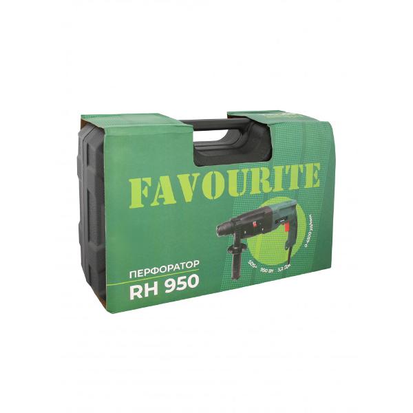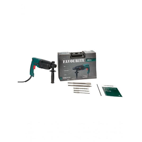 Перфоратор Favourite RH 950 в корпусе зеленого, черного и красного цветов обладает мощностью 950 Вт, энергией удара 3,2 Дж. Инструмент оборудован патроном SDS+, за минуту он делает до 4500 ударов, работает в трех режимах, есть функция реверса. Щеточный двигатель расположен горизонтально. Эта модель оборудована двумя прорезиненными рукоятями, фиксатором кнопки включения, буром и ограничителем глубины. Длина сетевого кабеля — 2 м. Габариты устройства — 29х10х43 см, вес — 4,2 кг.