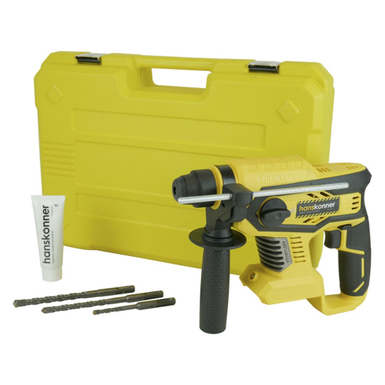 Перфоратор Hanskonner HRH1824BL работает в трех режимах: сверление, сверление с ударом и без сверления. Комплектуется прибор буром в количестве трех штук, дополнительной рукояткой для фиксации инструмента, смазкой и кейсом для удобной транспортировки.