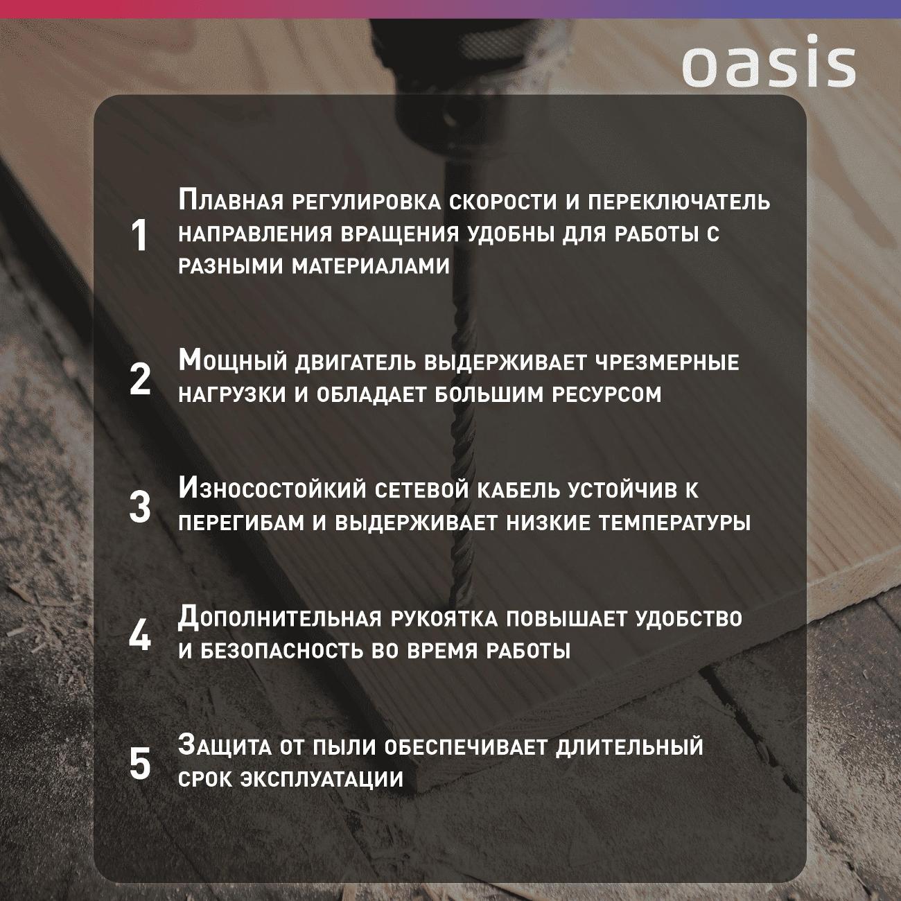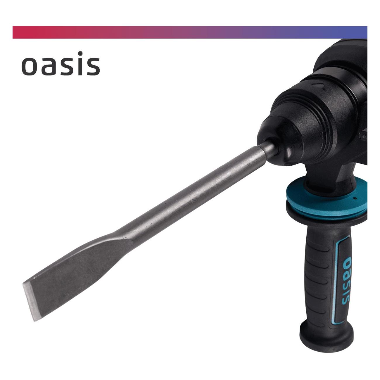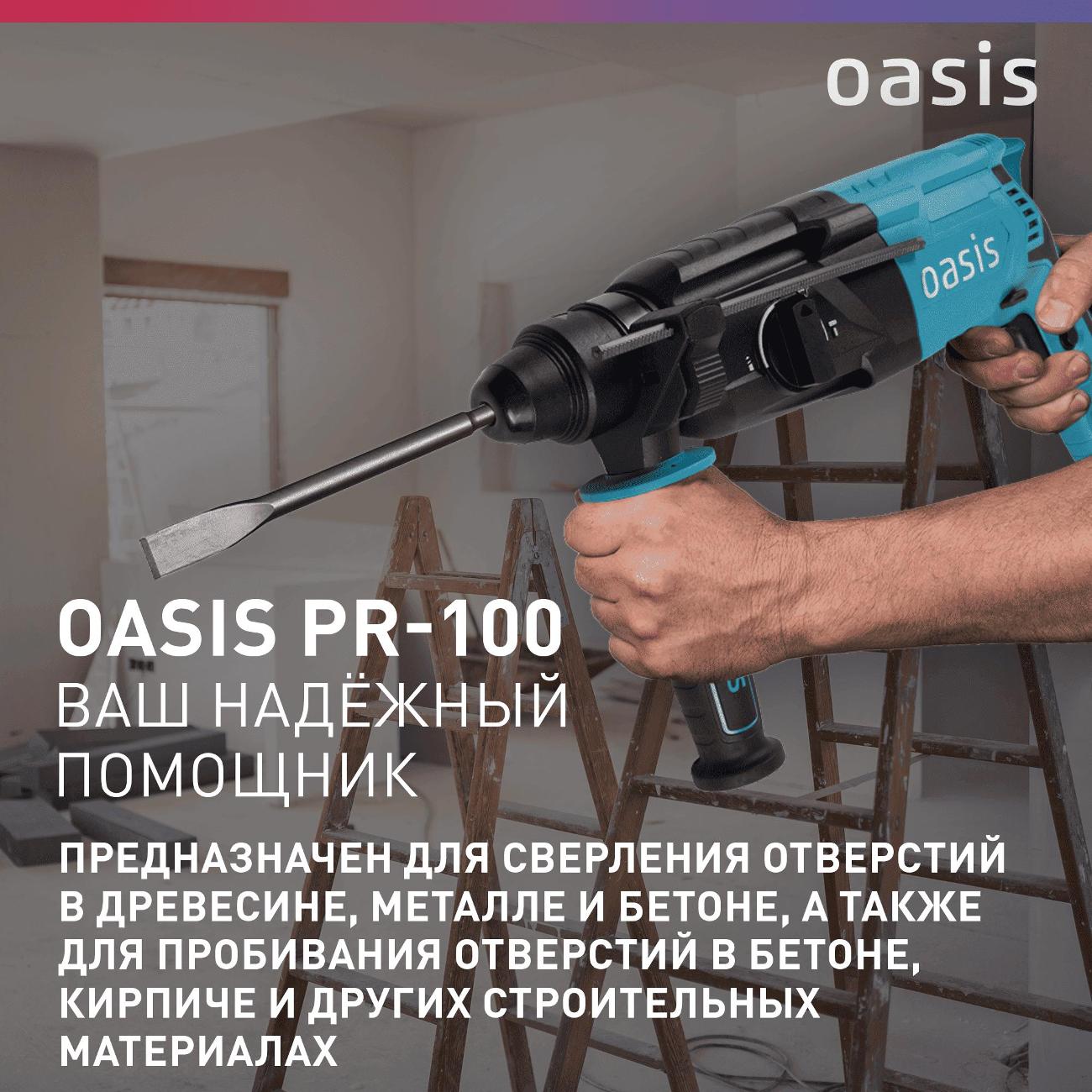 Перфоратор Oasis PR-100 — инструмент бытового типа мощностью 1000 Вт функционирует в режимах сверление, сверление с ударом, долбление. Инструмент позволяет сверлить в металле, камне, бетоне, дереве с возможностью регулировки диаметра. Максимальный диаметр сверления буром в бетоне равен 30 мм. Сила удара составляет 4 Дж. Функция реверса позволяет легко выкручивать сверло из материала при заклинивании.