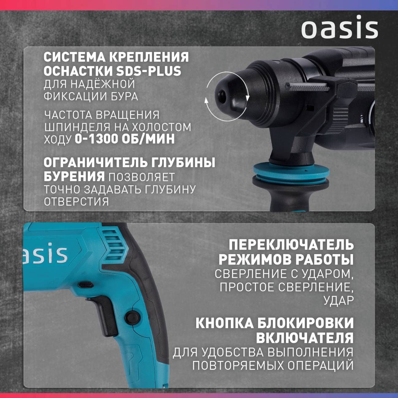 Перфоратор имеет 3 режима работы: сверление с ударом, сверление, долбление. Режимы можно изменить на специальном переключателе. Головка у перфоратора Не съёмная. На самой рукоятке находит кнопка запуска, блокировка кнопки включения и