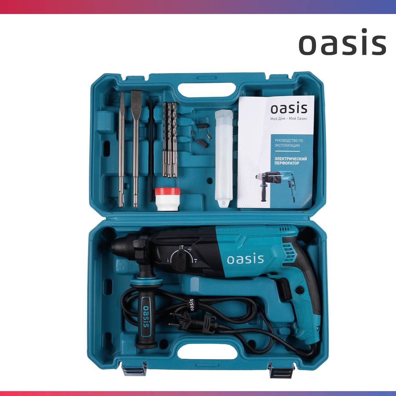 Сам перфоратор и его комплектующие хранятся в специальном кейсе, что очень удобно, как для хранения, так и для транспортировки. В комплект входит: